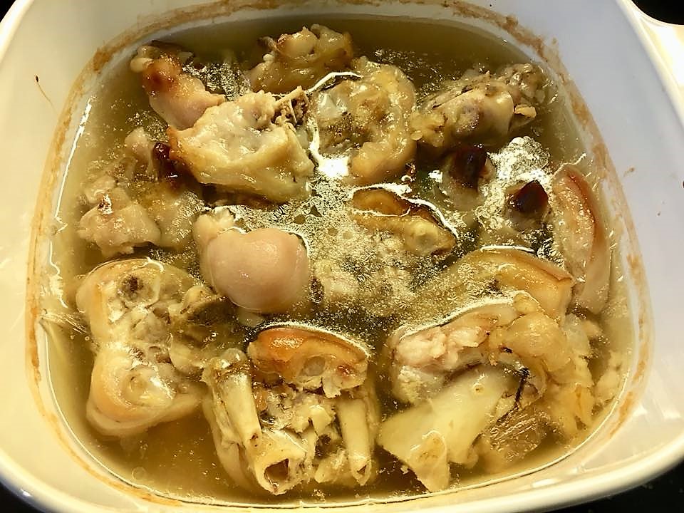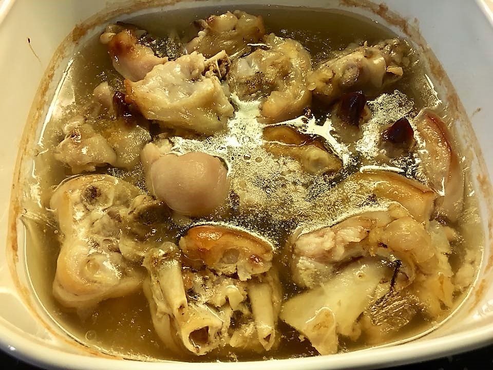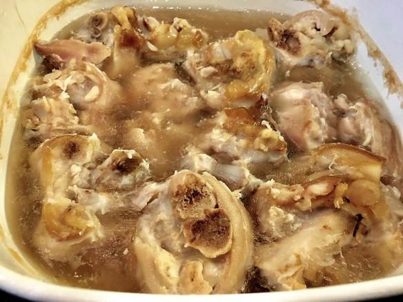 my marinade (tbsp flat sugar, 1 tsp salt, 1tbsp white vinegar, 4-5tbsp shaoxing wine) made a very, very tasty braise (and of course excellent jelly for the jelly pig skin dish). 🙂