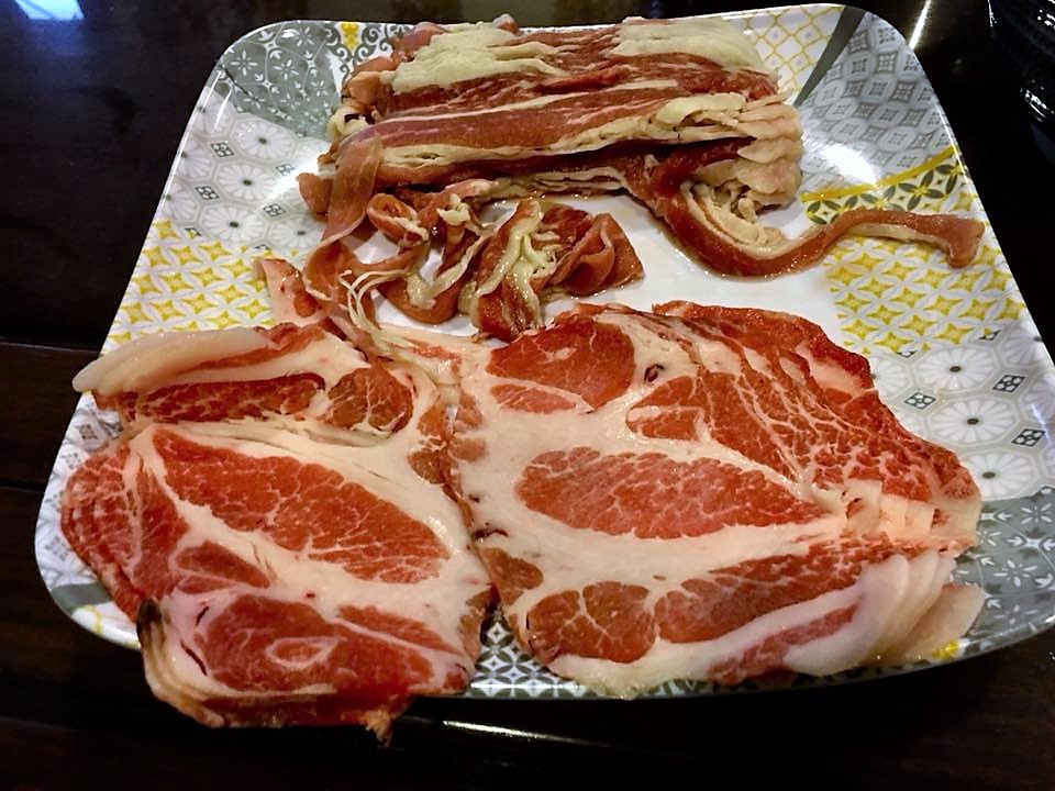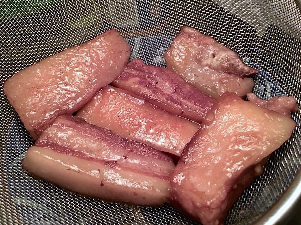 belly pork is slow braised in 130degC oven for 4hrs. this made it slight overcooked & very tender but will fall apart if you try to cut it or if heated up & boiled.