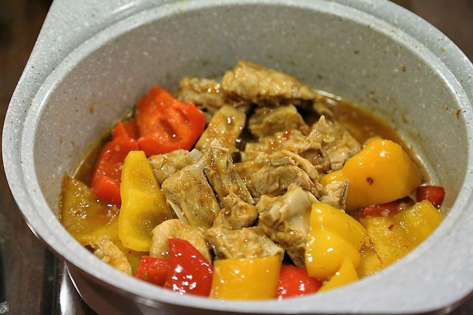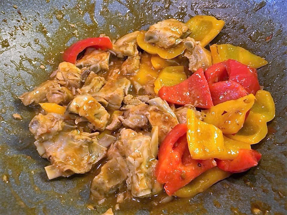 i made also spicy bean sauce pork softbones with yellow & red peppers.