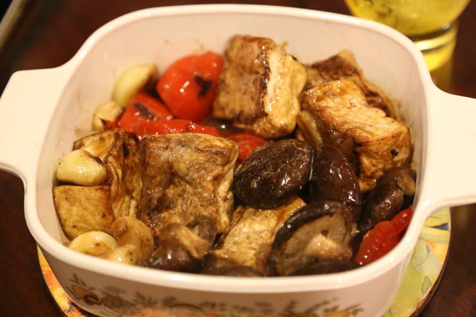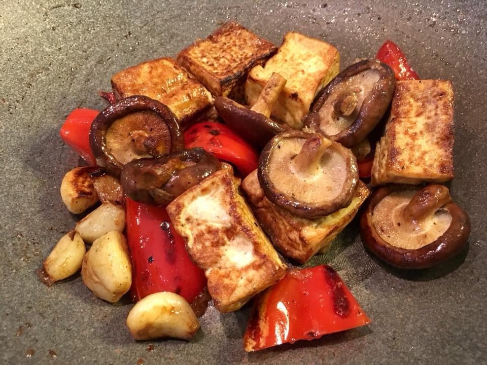 vegetarian dish for suresh-fried tofu, red pepper, shitake mushrooms