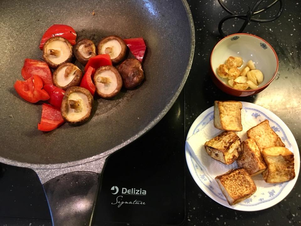 i prepared a vegetarian dish for him, fried tofu as the mains & red pepper & shitake mushroom as sides.
