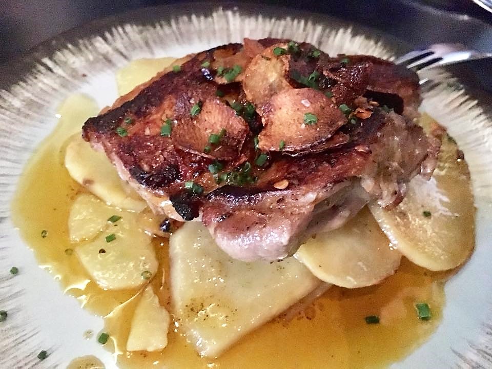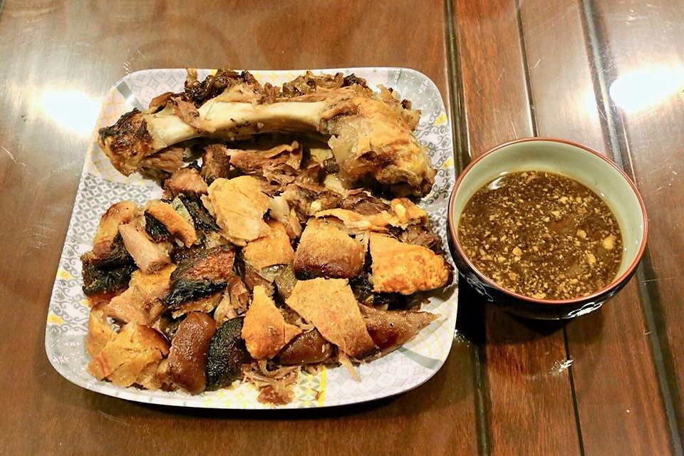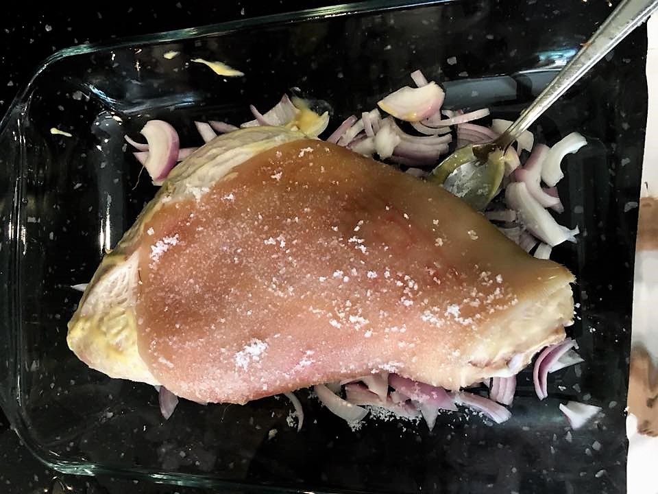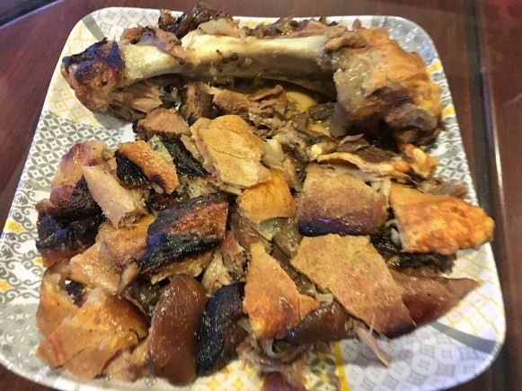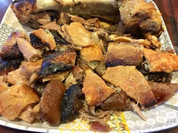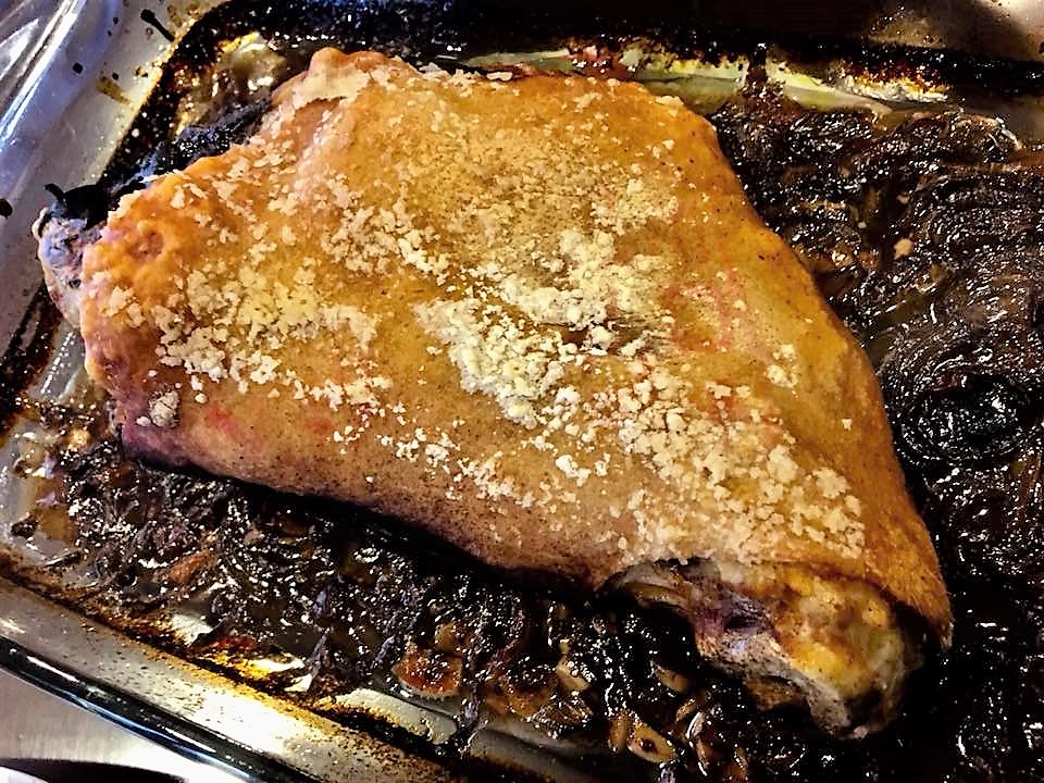 very crackling becos salt on the skin pulled out the water content & 3hrs in 175deg oven, flavourful becos coke & red wine on a bed of onions also ensured that the meat is moist & not overcooked over 3hrs.