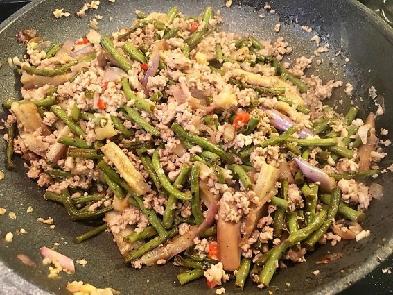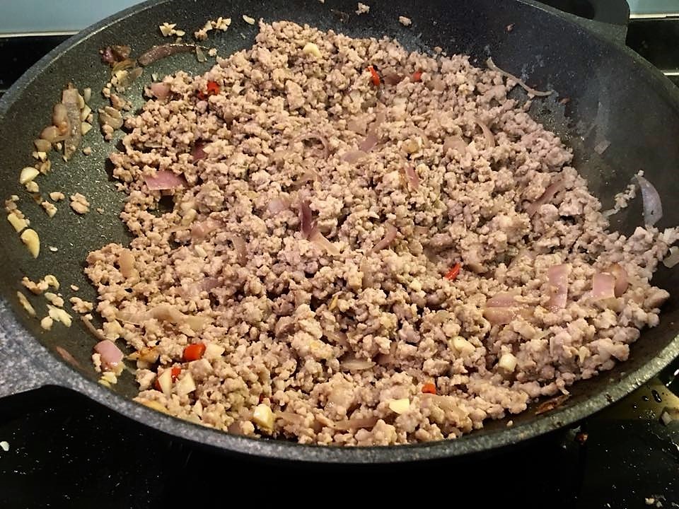 i used frozen pork chops from sheng shiong, sliced the 5 pieces to make 10, marinated with fish sauce, white pepper & 1tbsp corn flour.