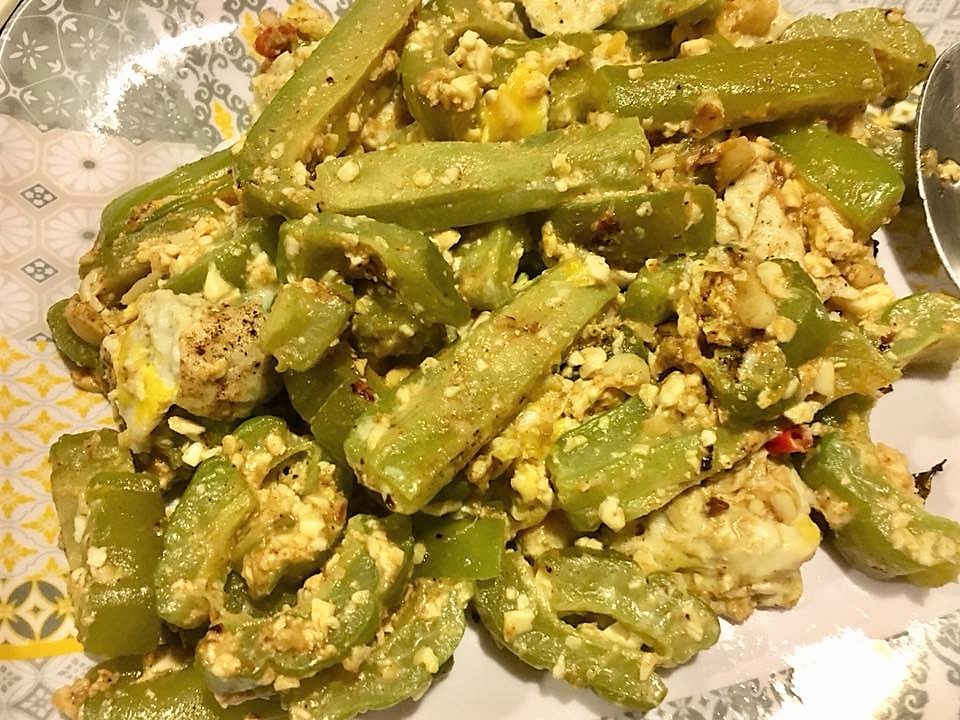 minced one cooked salted egg, fried bittergourd with salted egg & set aside. when about to serve, heat up, add a little oil, fried 2 eggs on the side till eggs harden, the fold over the bittergourd. excellent zai shun famous dish!