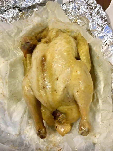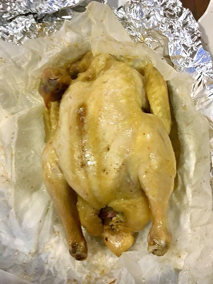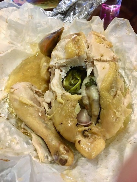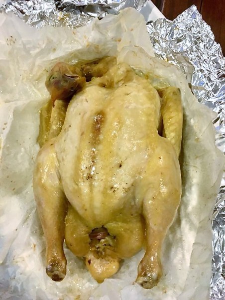 - then wrap around tightly in baking paper, & then aluminium foil..place in 175degC for 1hr 20mins then open up to check doneness & left open to brown another 20mins so total 1hr 40mins for a 1kg jampung chicken. 🙂