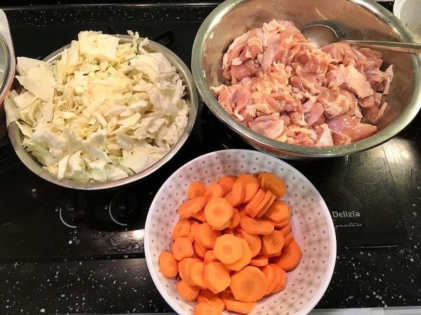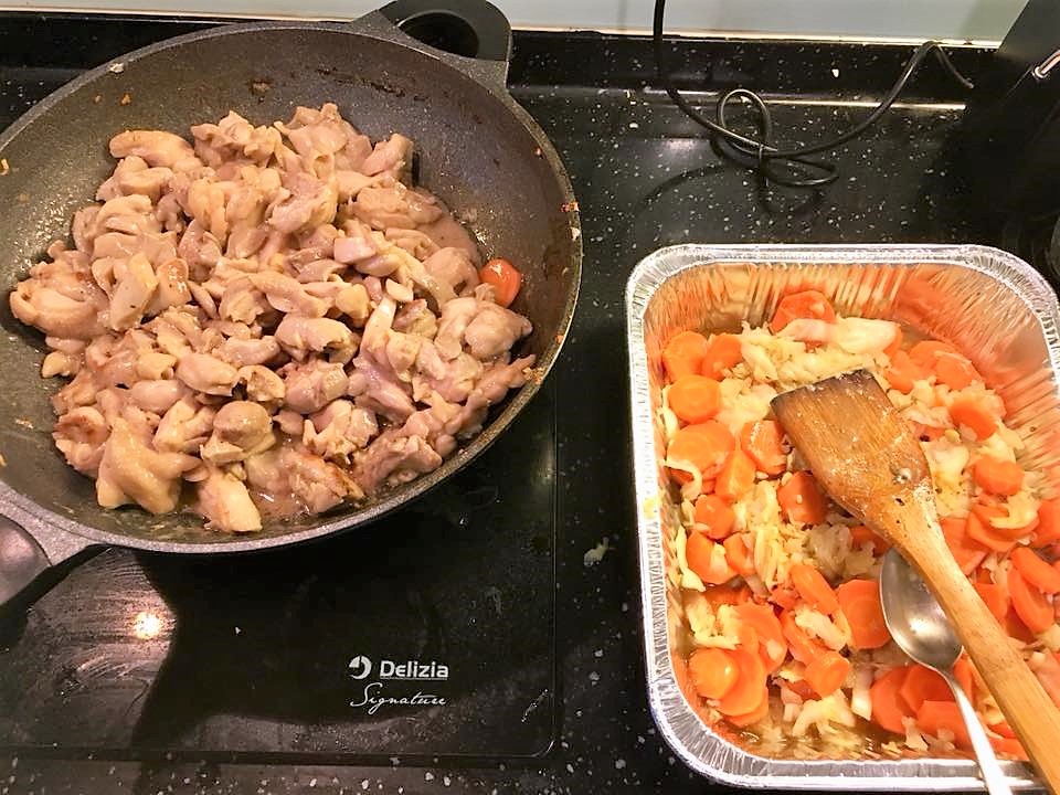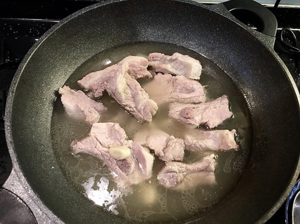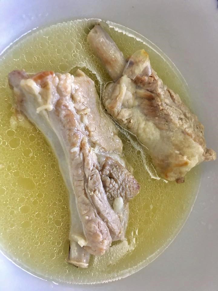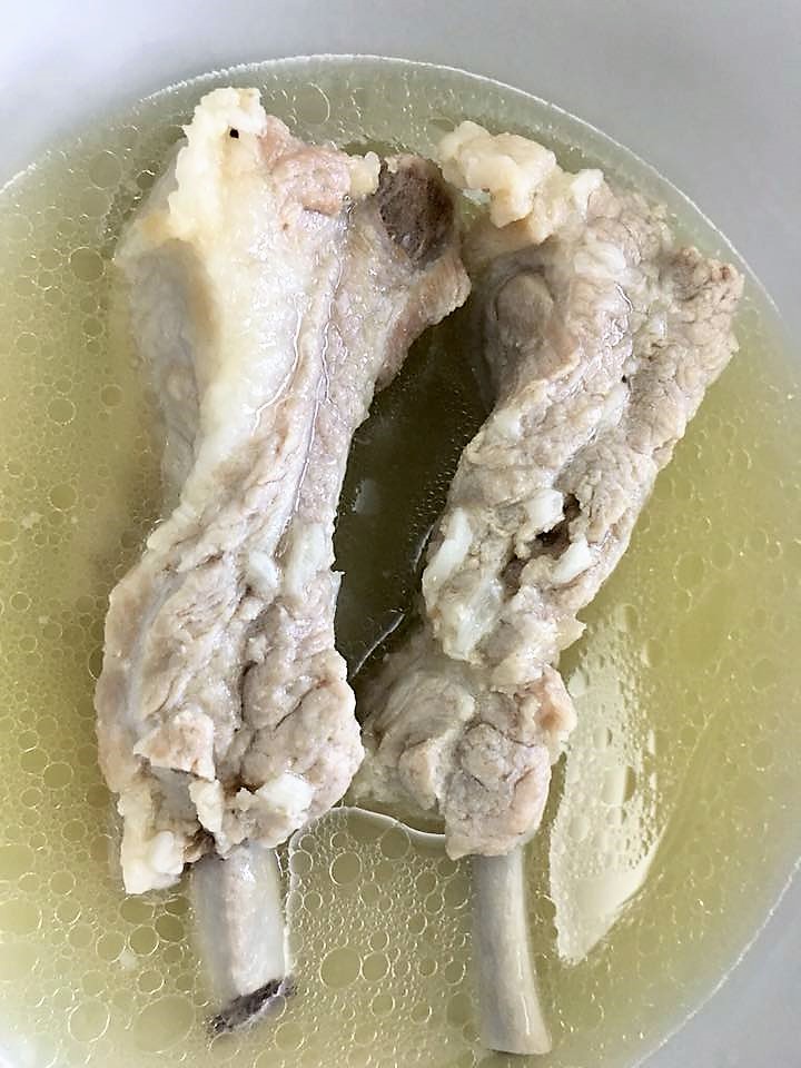 placed ribs in boiled water, cleaned to remove scum. then added clean water, whole bulb of peeled garlic cloves, the ilc stock sachet, & the ribs, boiled for 1 hr.