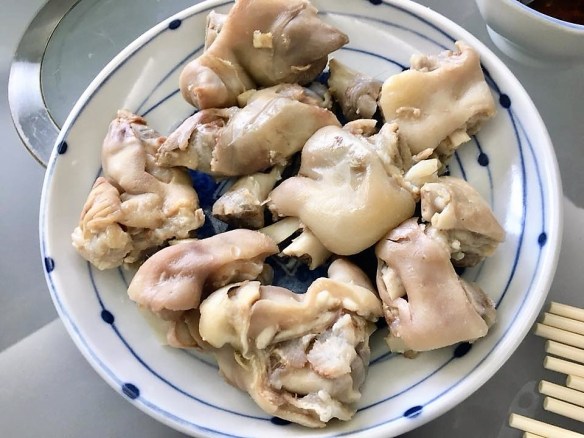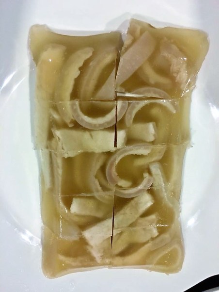 texture of my chilled trotters was good. the way to do this is to overcook the trotters a little (i had it in a 130degC over for 6-7hrs), with a good marinate that became very tasty with the gelatine from the trotters…