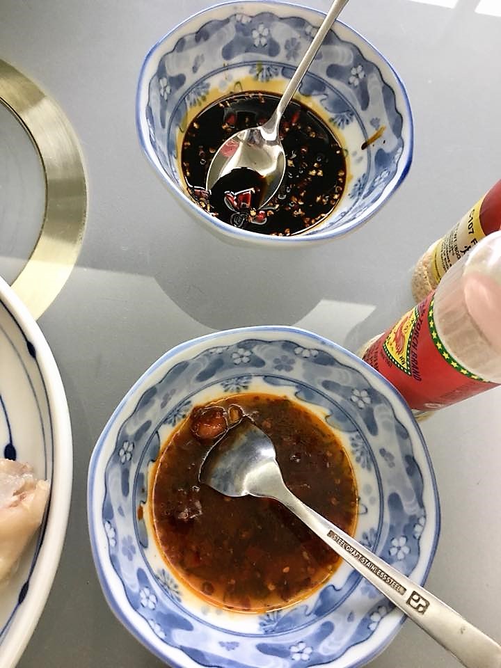 chicken rice dark sauce for bkt + white vinegar mala sugar & stock dip for trotters