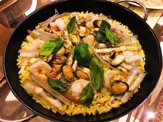 the difference between paella and risotto primarily, risotto more wet and paella like claypot rice you just leave it and it’s ok to be slightly burnt though mine wasn’t. and risotto a bit more refine, usually you do not add so many items on it so the one big colourful plate ones with lots of ingredients kind of usually paella.