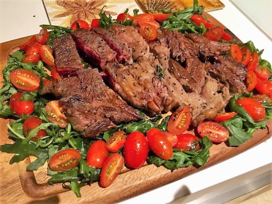 wife bought wagyu MS4 i think 50% off from cold storage, so we made tagliata di manzo with nice perino cherry tomatoes and rockets.
