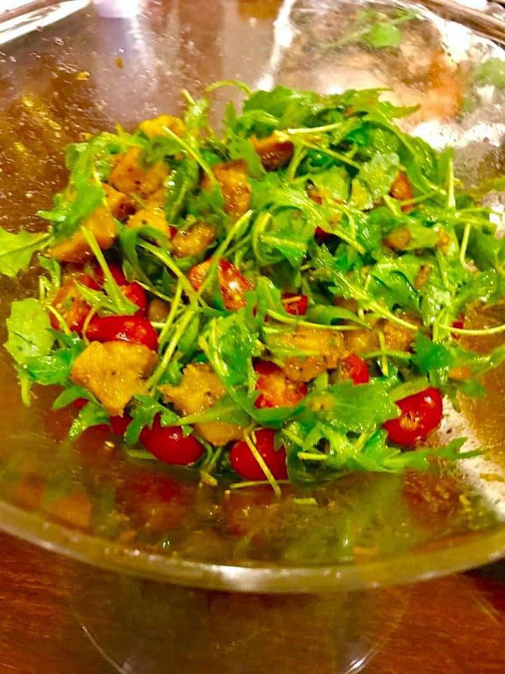 salad can only toss when serving, otherwise rockets will lock soft & wilted when soaked in olive oil etc for too long. for some reason it appeared that way, so i added more rockets and tossed again. and it was good.