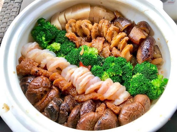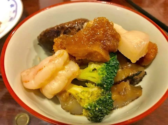 2 įč-prawns, broccoli, fish maw, sea cucumber, mushrooms, belly pork, abalones
