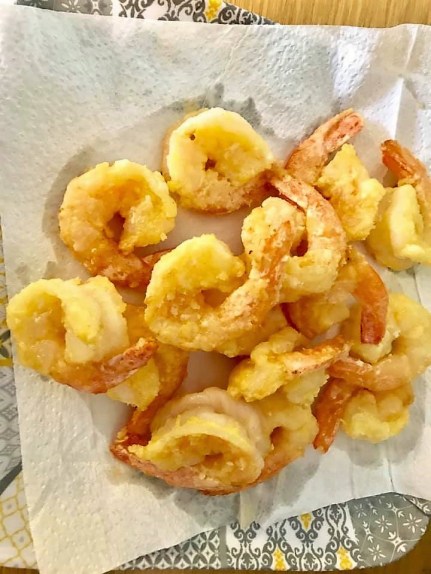 prawns were done the same, coated with egg yoke and cornflour and shallow-fried for 1 min to golden.