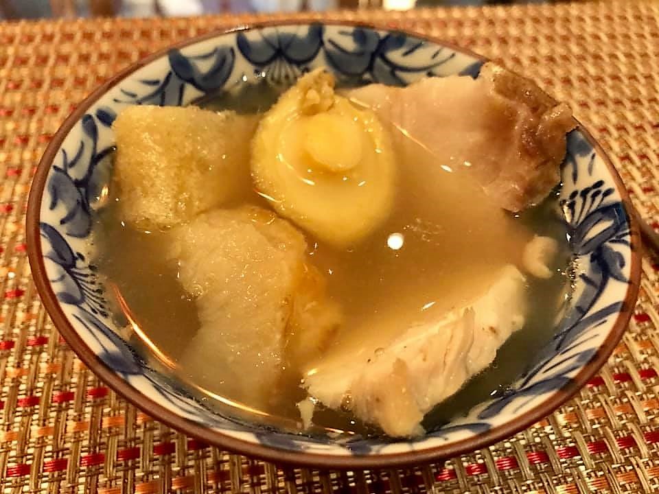 i use 2 pig trotters & a SKINLESS chicken leg (thigh plus drumstick) and belly pork to provide a very sweet, tasty, gelatinous soup base. then added fish maw, sea cucumber, pig tendons, chicken breast and each at the right timing to deliver great texture.