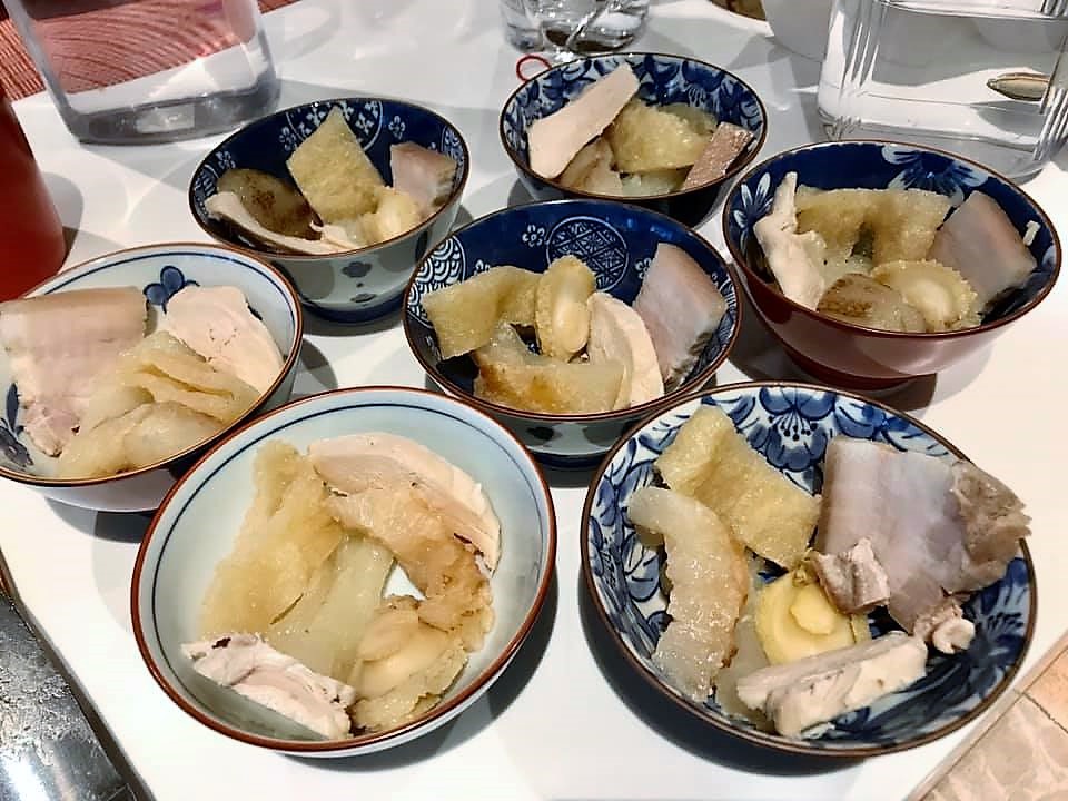 - poach & clean trotters and belly pork, clean them and skinless chicken leg, place in cold slow cooker filled with water (about 1.5l to 2l) turn to low, add 1tsp flat salt, about 6hrs. (can also use a meat thermometer set at 90degC on the belly pork).