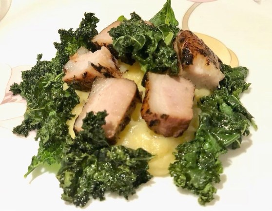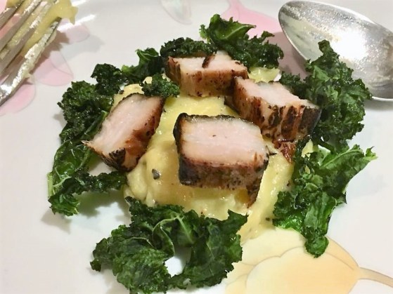 i served the mash with flamed red wine slow braised belly pork and kale.