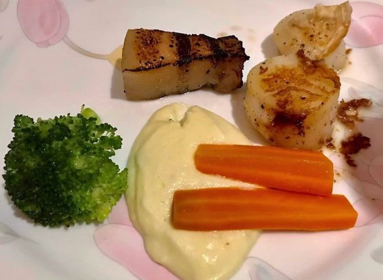 this time i added pangrilled scallop and also a flamed belly pork. the same belly pork i did for the buddha jump over the walk, braised in the stock 2hrs so very tender..then added seasalt, black pepper, olive oil adn drizzle with honey, then flamed. superb!