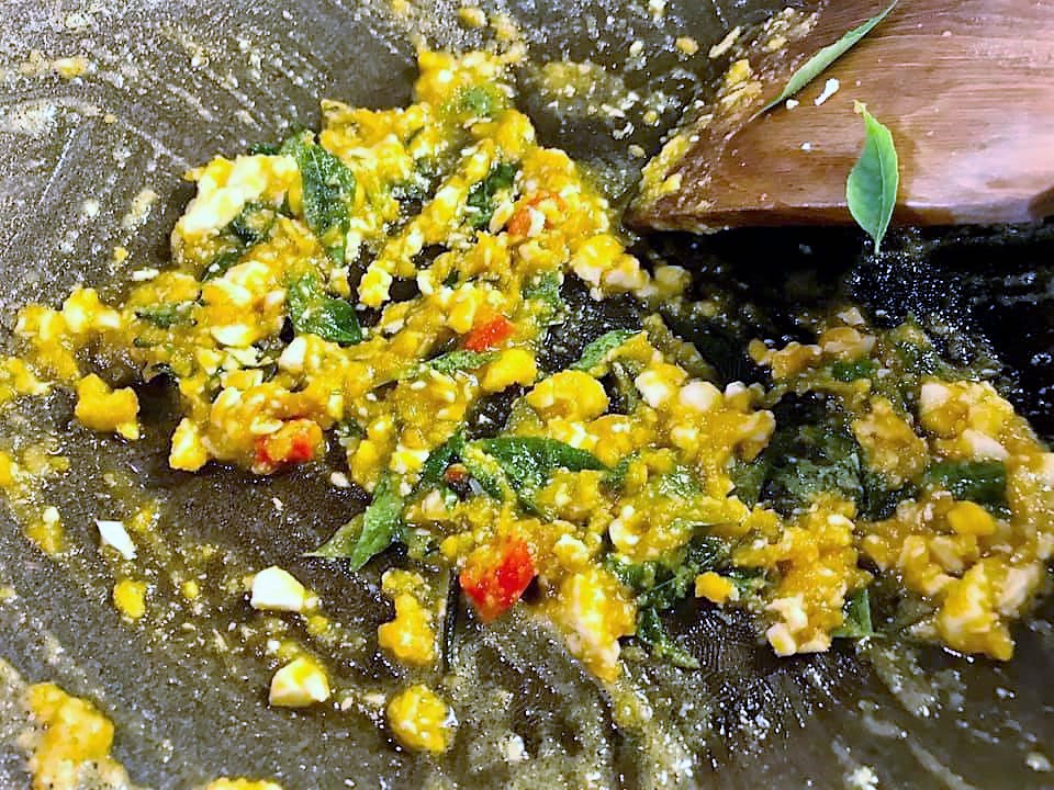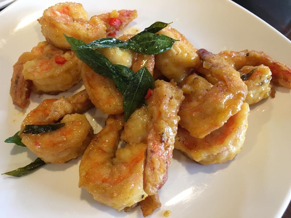 and then it’s just to fry cut chilli padi + curry leaves in the salted egg mayo sauce mix, then add the prawns to coat.