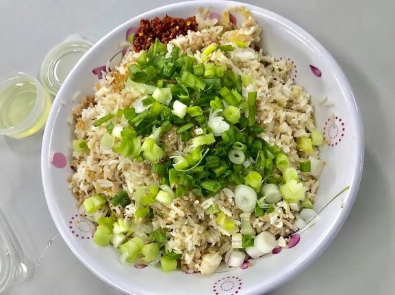 the fried rice is best presented on a large plate garnished with chopped scallions. i added crispy chilli.