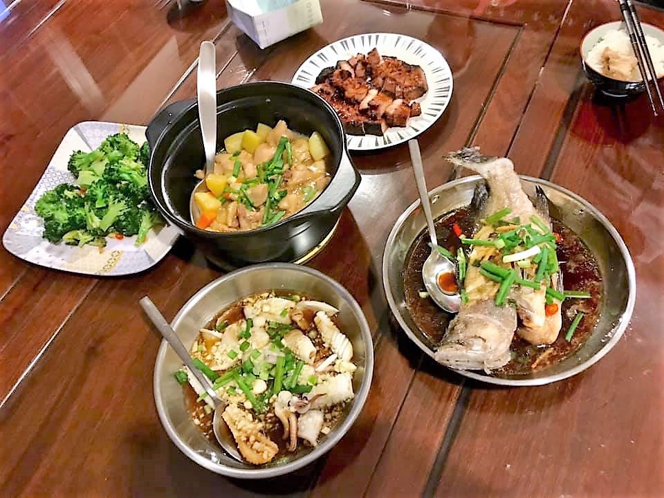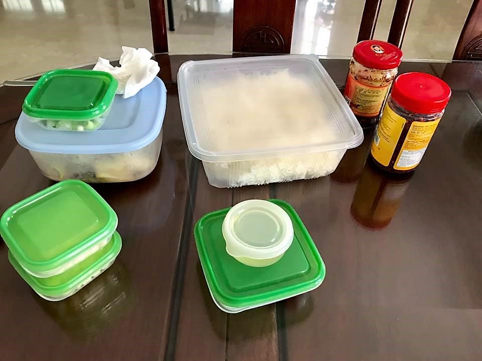 so there were many ingredients/boxes i have to bring – like cooked rice, minced pork, salted fish, egg white, chopped garlic, oil chopped scallions and crispy chilli for garnishing the fried rice, mala chilli for frying the 回锅肉 doublecooked pork etc.