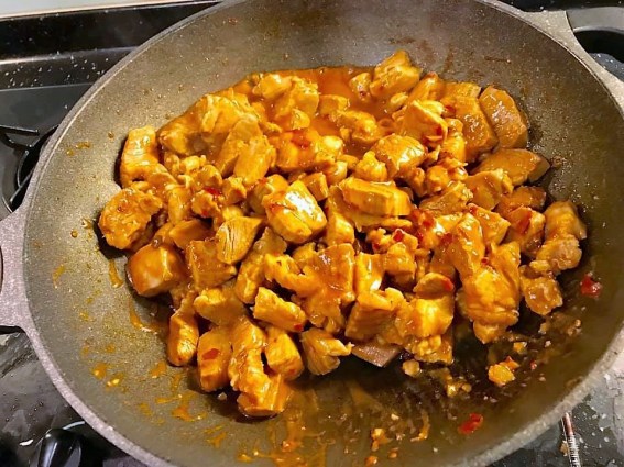 so now just put the leek and onion to the wok on high heat, added the cut belly pork, then added 1 tbsp of mala chilli oil…(because request to add less, i added 1tsp…later everyone said it was very fragrant not enough though so some added more themselves).