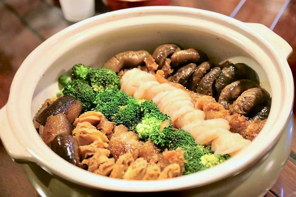 2 盆菜-prawns, broccoli, fish maw, sea cucumber, mushrooms, belly pork, abalones