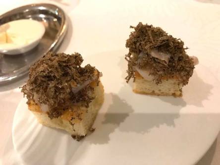 onsen egg, porcini mushrooms, covered with black truffles Published March 18, 2020 at 960 × 720 in Wife arranged best 6-course Degustation Dinner at Buona Terra on 16Oct2019 ← Previous Next → side dish for 3rd course – crouton with shaved truffle