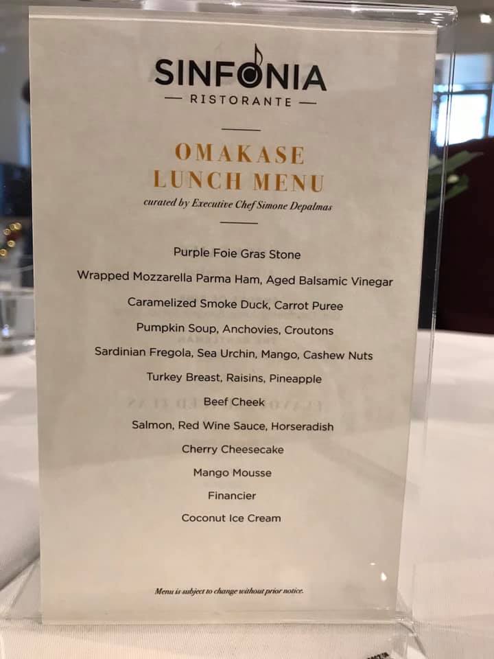 sinfona omakase lunch menu Published March 22, 2020 at 720 × 960 in My RI Bro CL bought lunch @ Sinfona on 22Dec2019 ← Previous Next → sinfona S$58pax omakase lunch menu