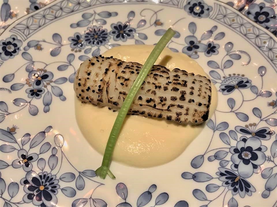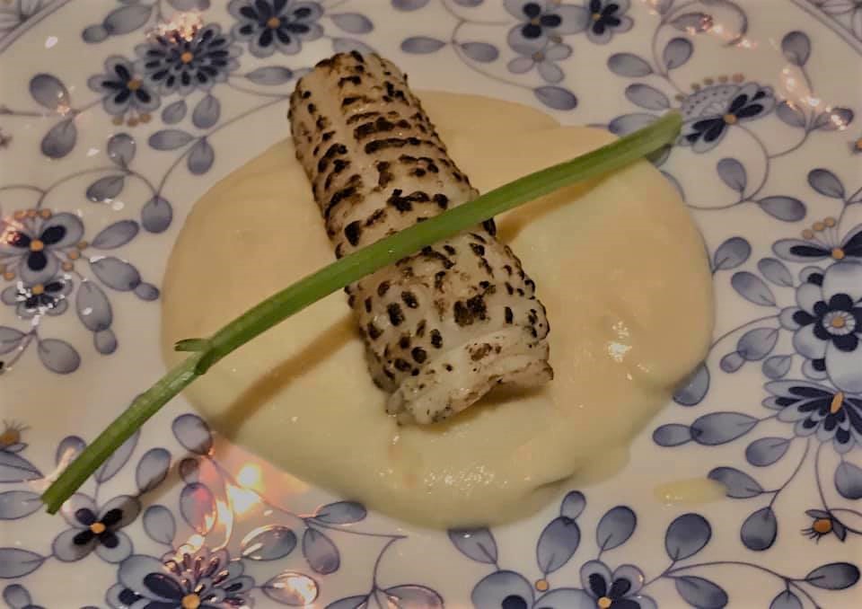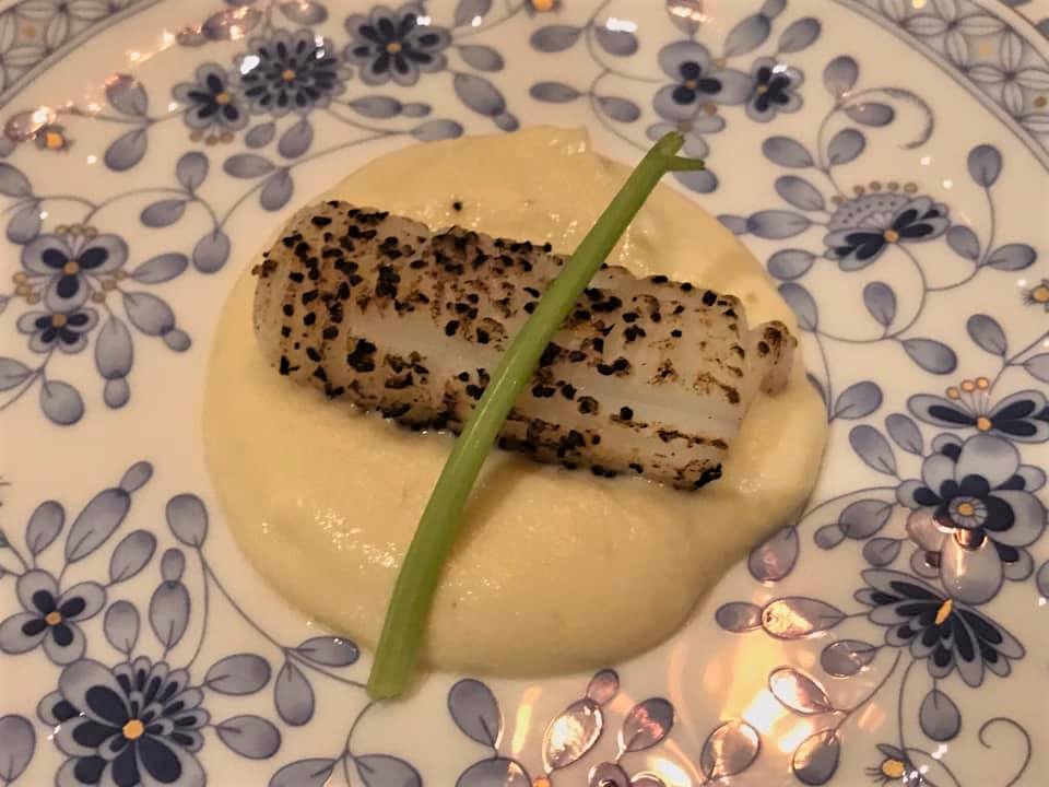 flamed squid on cauliflower puree