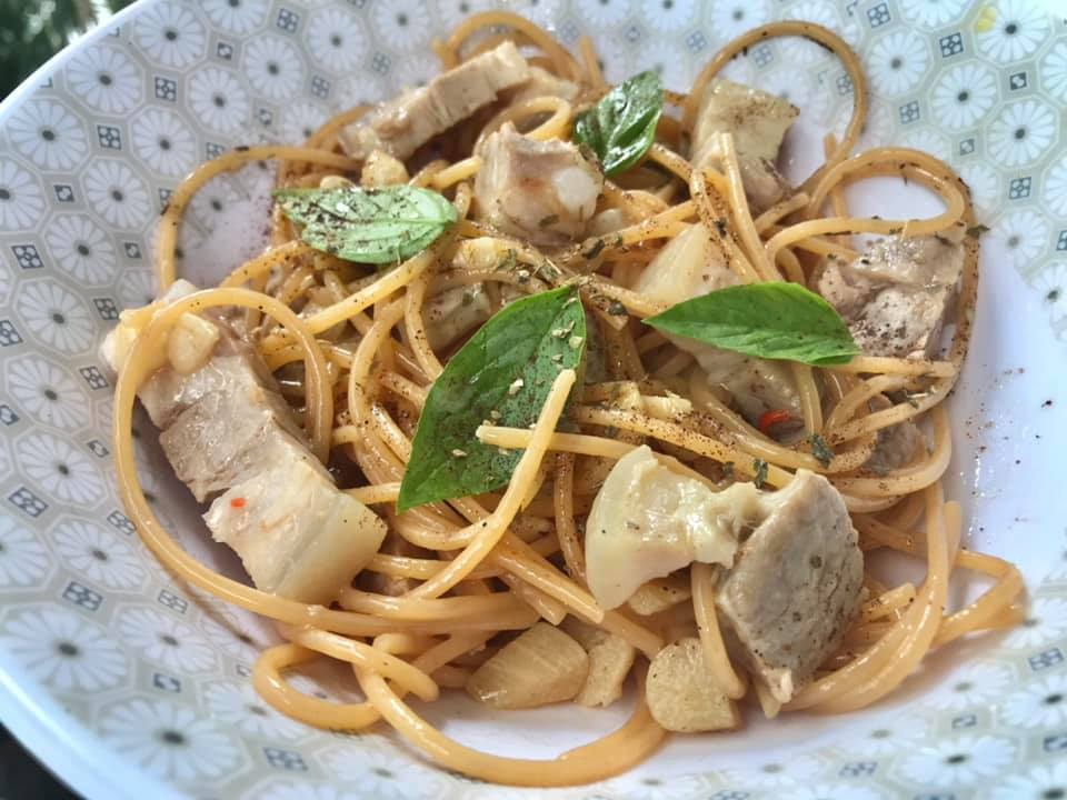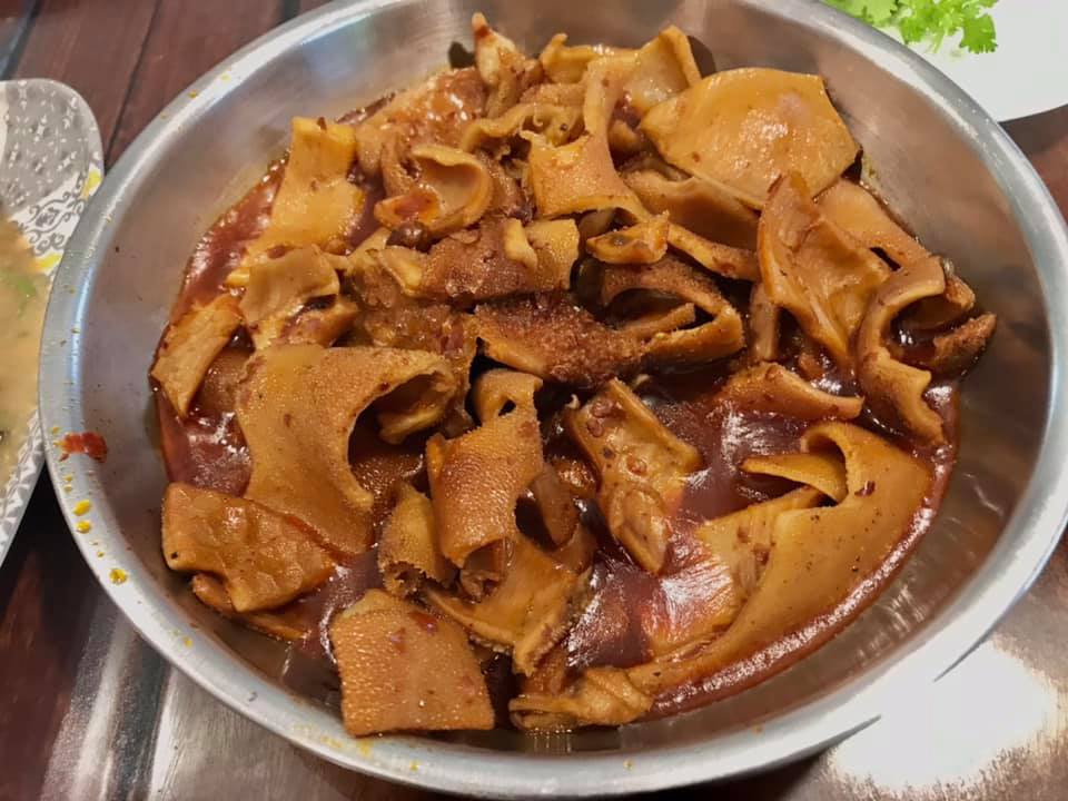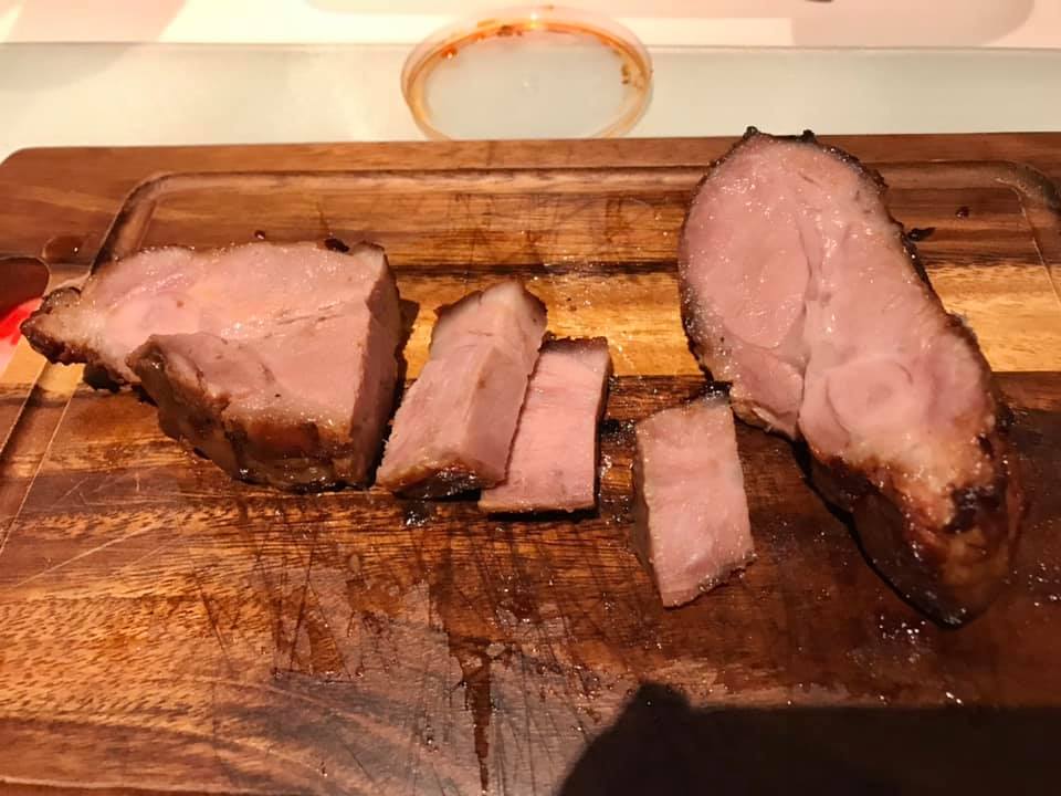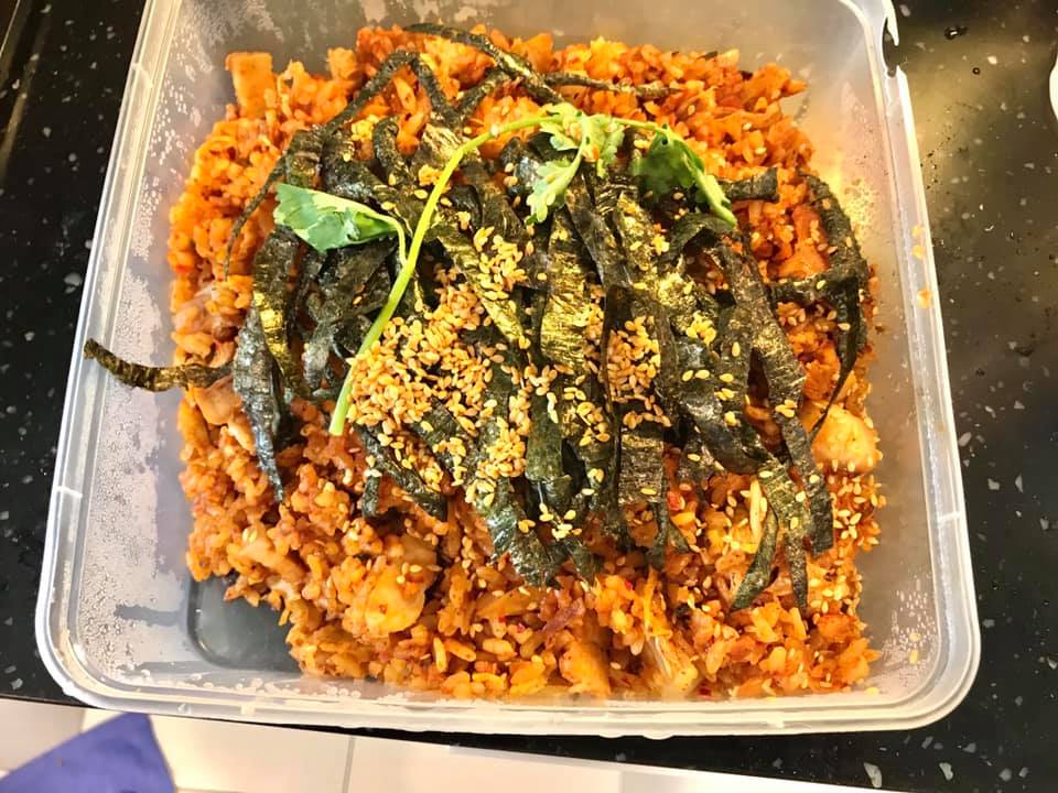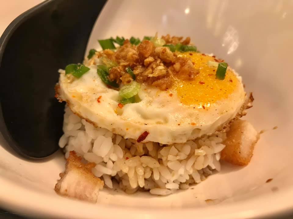for belly pork fried rice, boil 400g belly pork in chicken stock for 1hr 15mins. then place belly pork in cold water, so that it is easy to cut into rectangular sliced. add chopped garlic and fry in wok cooked rice (from 1.5 cups), push to one side then cracked 3 eggs on hot oil and let the eggs formed, then spread over the fried rice. add also crispy prawn chilli. this a perfect dish of fried rice with good woke.