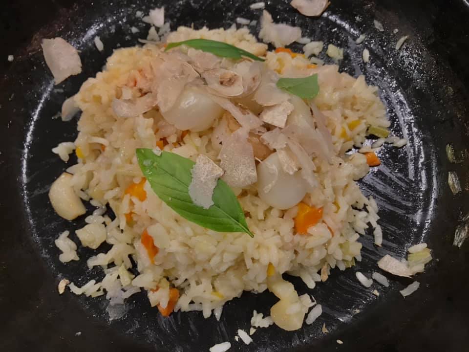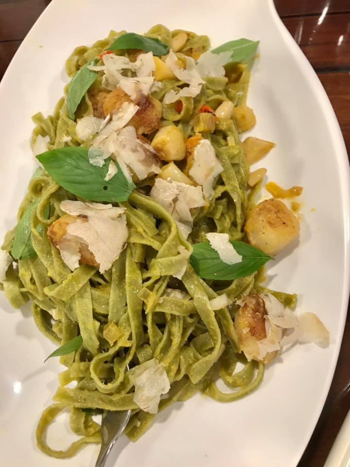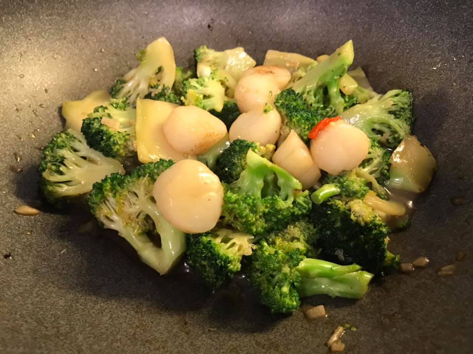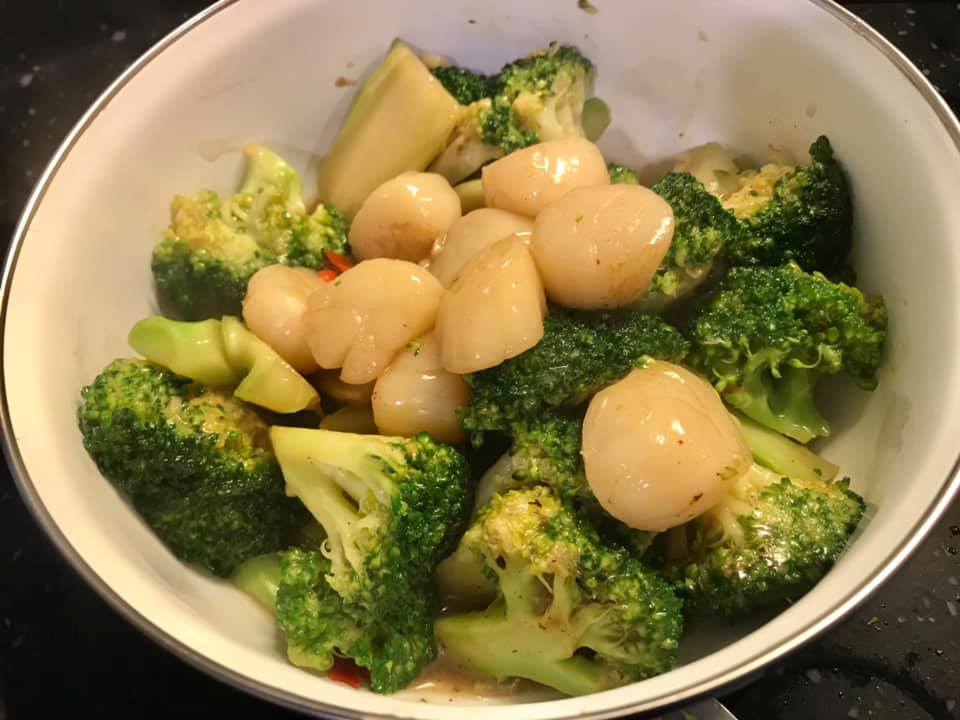scallops dish the usual, fry broccoli with chopped garlic, add scallops and fry.