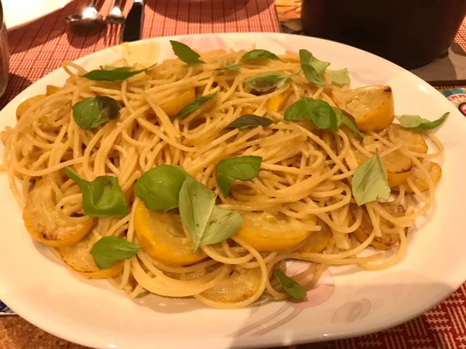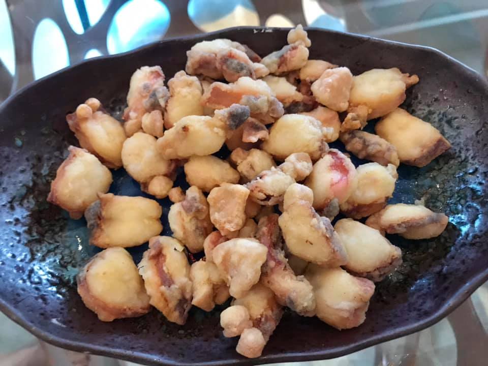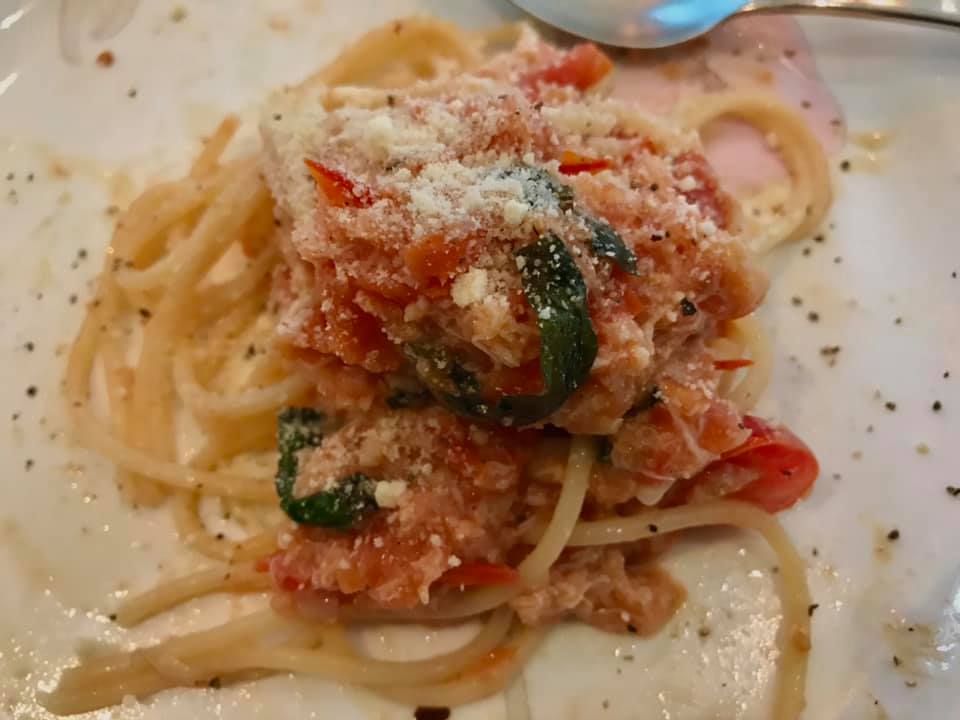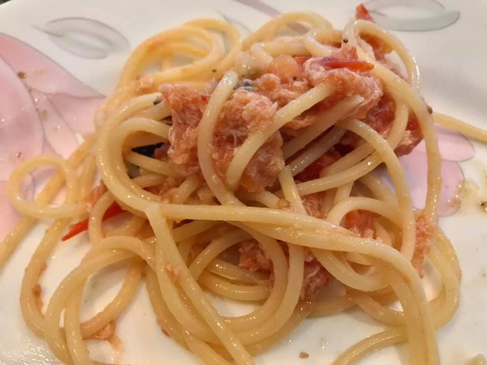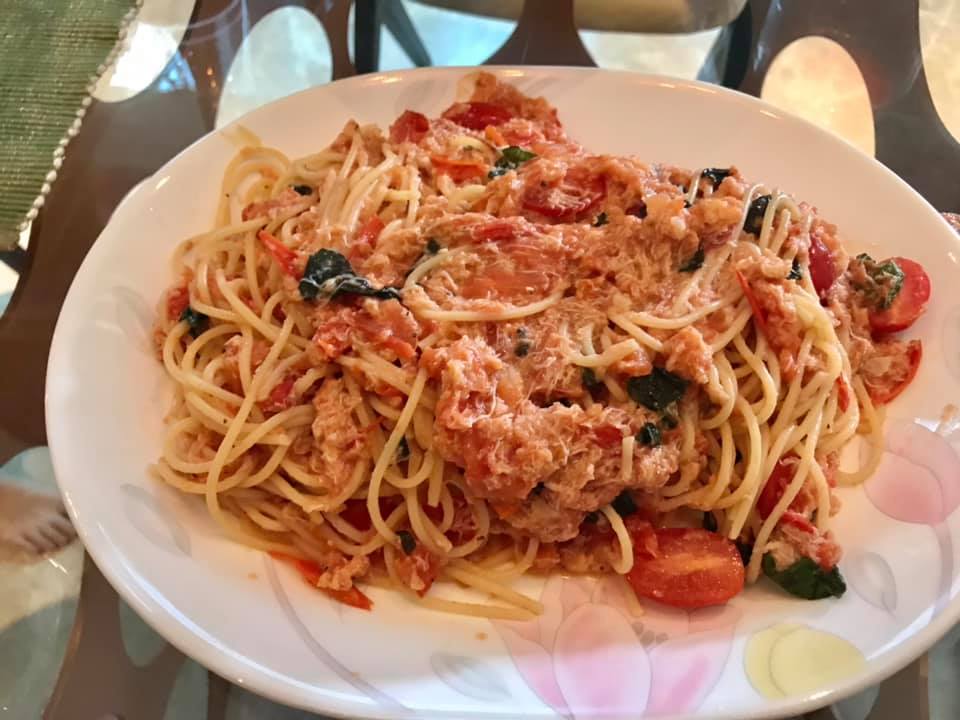 aunty bes made tako calamari, crabmeat pasta