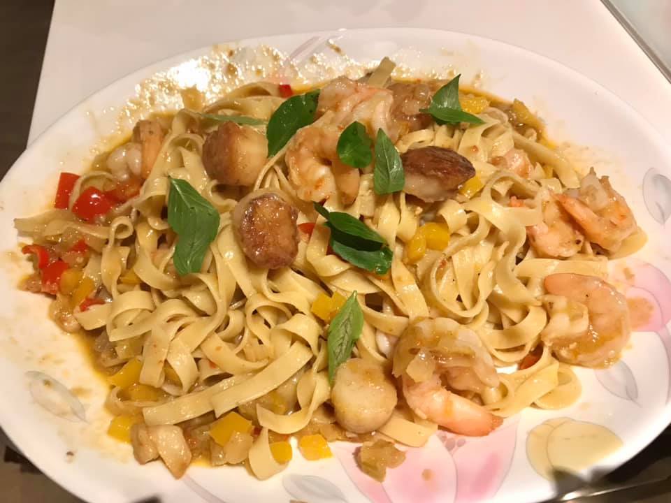 - prawn bisque sauce prawns & pan seared scallops tagliatelle