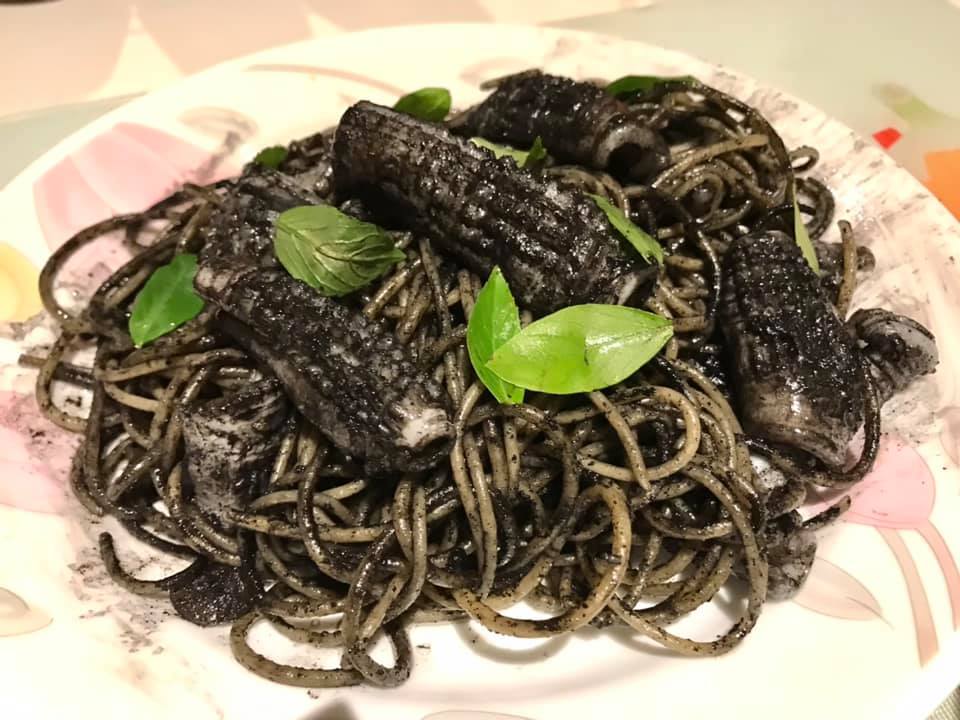 - squid ink sauce spaghetti with squid