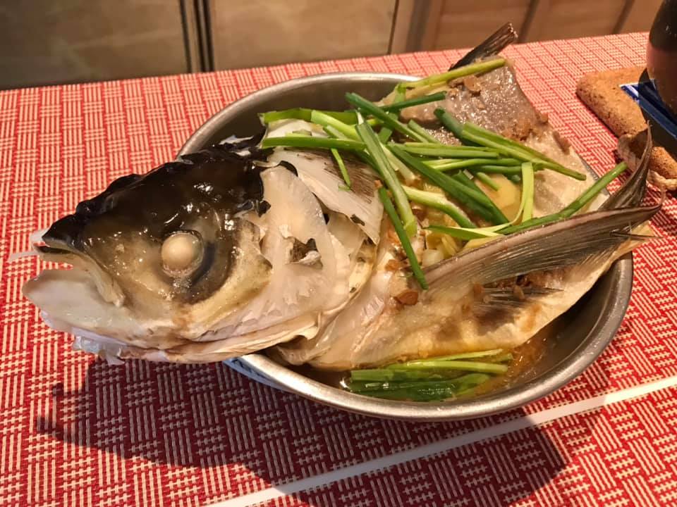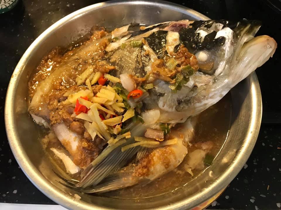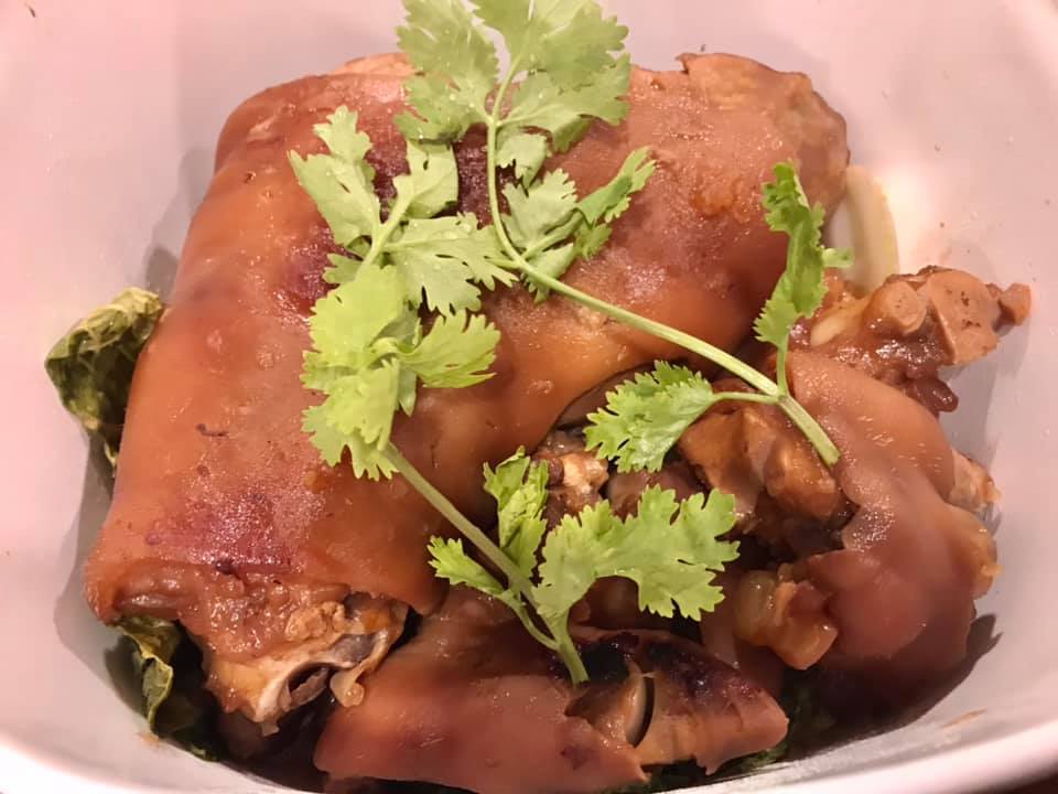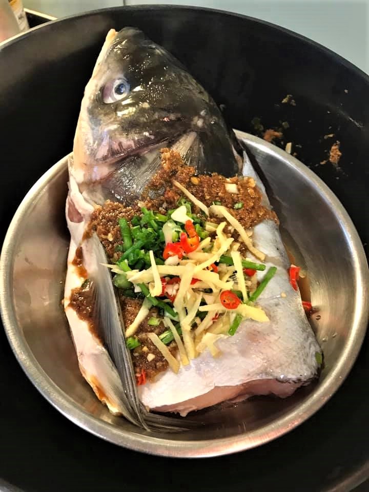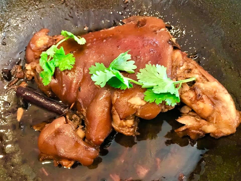 when serving use kitchen sears to cut or over a cutting board, and dip with “kek you” 桔油..