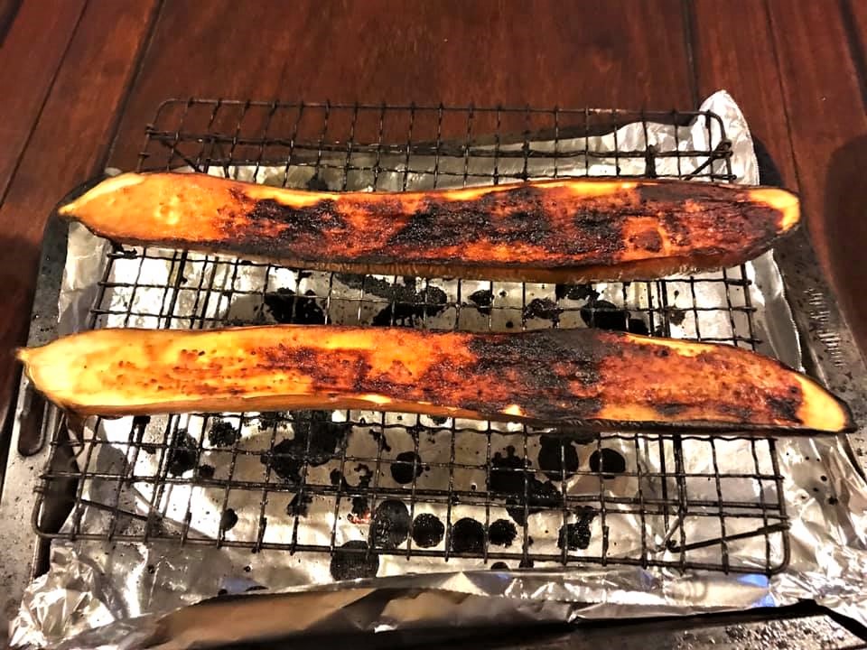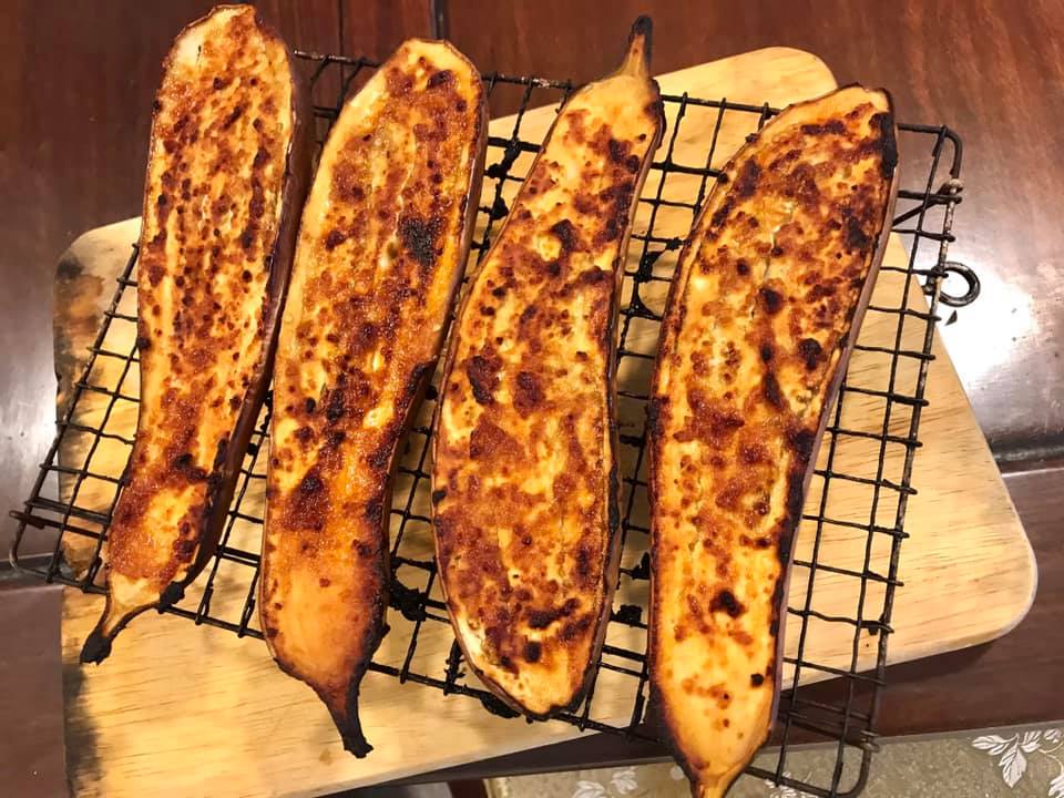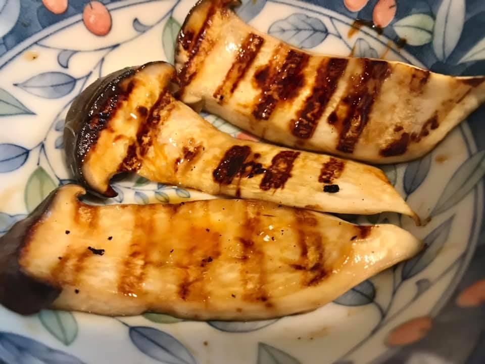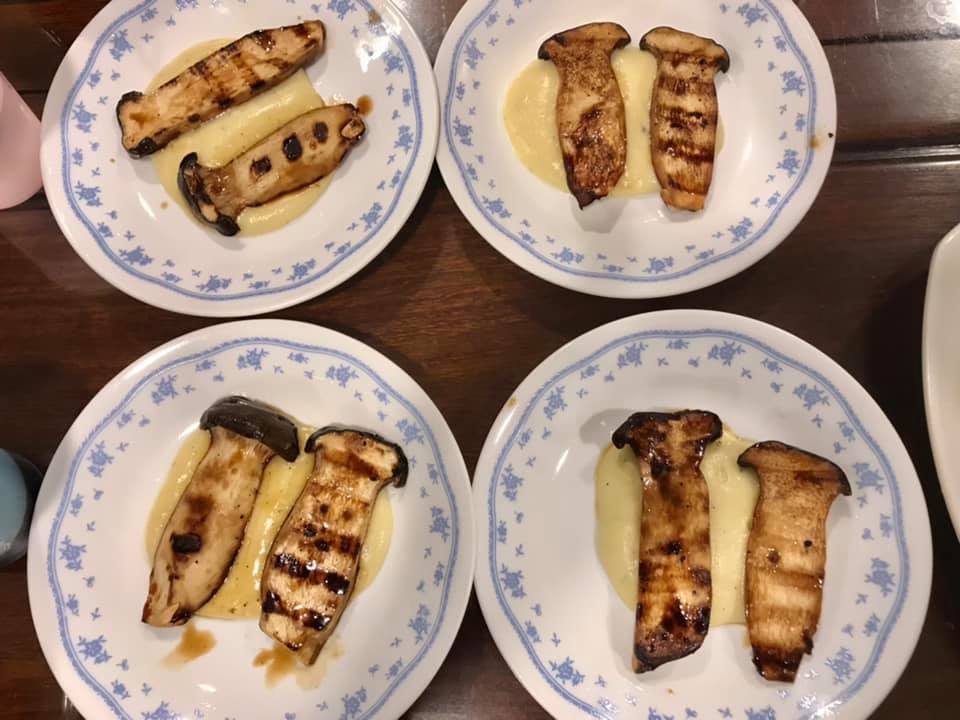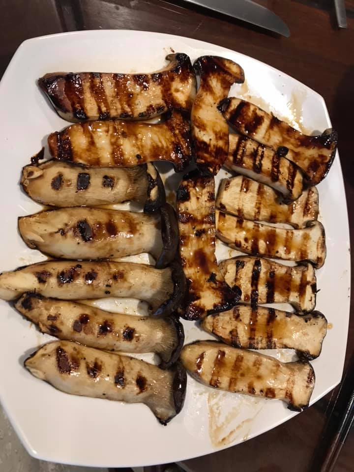 for the mushroom steak, I just cut thick slices of king oyster mushroom, soaked, marinated in tsuyu, mirin with 1 tsp sugar for 2hrs, then grilled over a portable bbq.