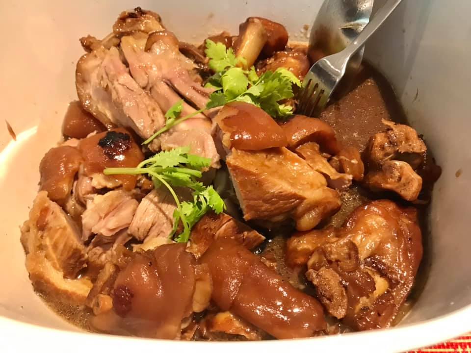 I like to use teochew braised hock and trotters as the base for the broth. this delivers a gelatinous and very tasty sauce. so braise the pig hock and trotters for 1.5hrs to 1hrs 45mins. remove hock and trotters. these can be served as separate dishes or can cut some hock and add to the 盆菜 pencai.