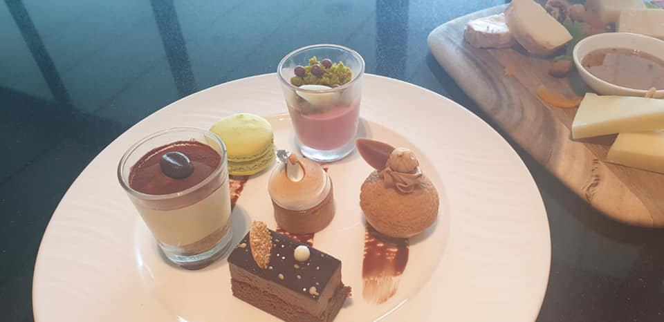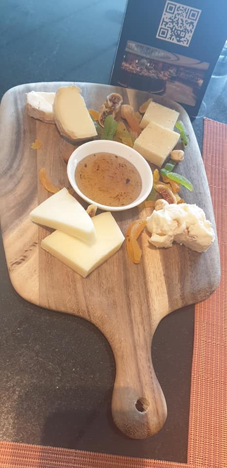 we shared the cheese platter and dessert platter. 4 cheese included blue, brie etc…really good, and dessert was great too.
