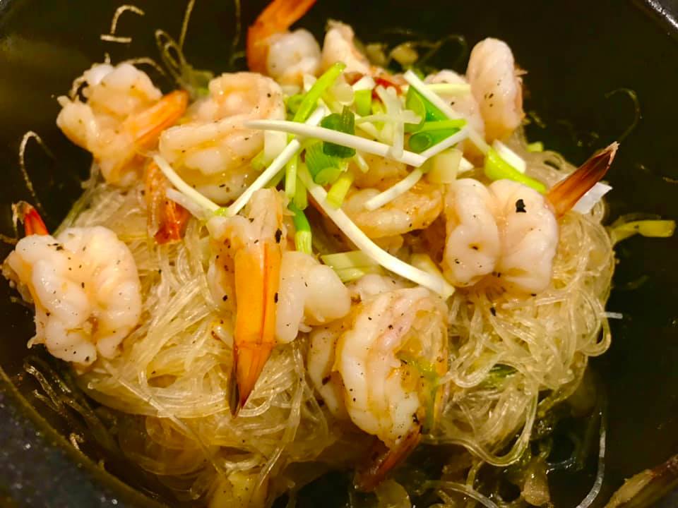 didn’t have coriander (an important ingredient) this evening. just fried garlic cloves, shallots and spring onions in oil, then added chicken stock and 1 tbsp oyster sauce and reduce, and lots of black pepper feel the aroma. when ready to serve, bring to boil the stock, add prawns seasoned with fish sauce and white pepper, then add tanhoon, cook 1 min, off fire and toss, then cover, cook in residual heat. garnish and serve! 😉