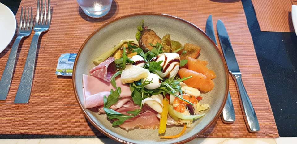 antipasto was fabulous with good quality meats-ham, prosciutto, salami, and smoked salmon,,scallop on shell, excellent burrata, cheese and grilled vegetables.