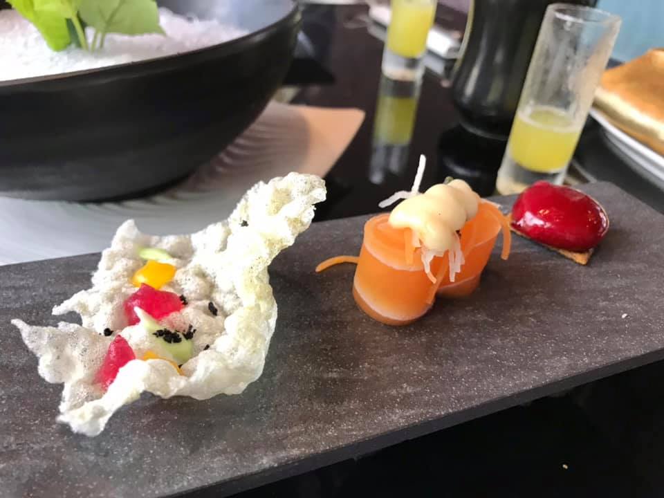 chef appetiser-salmon sashimi most impressive perfect cured texture, crackers & raspberry were good