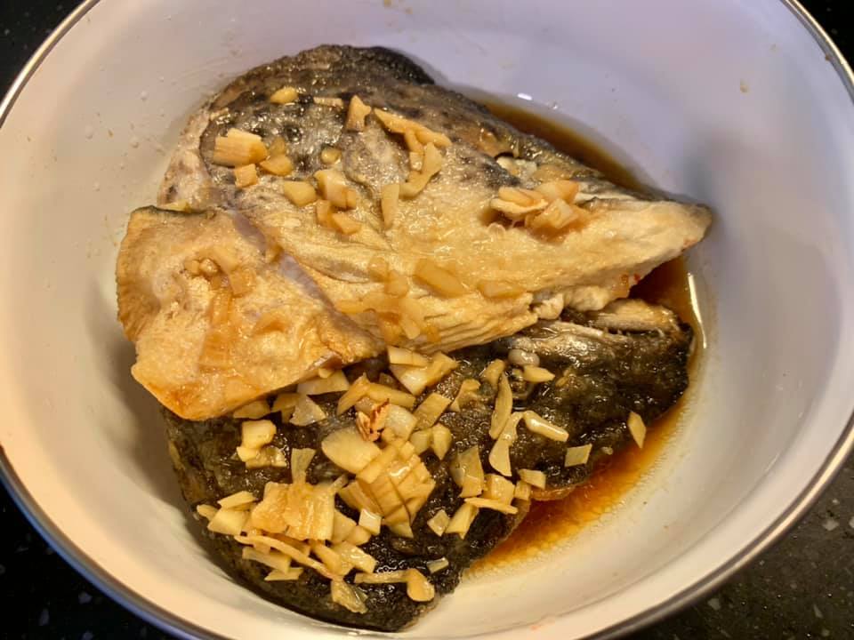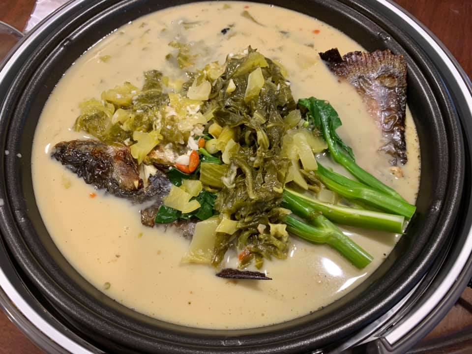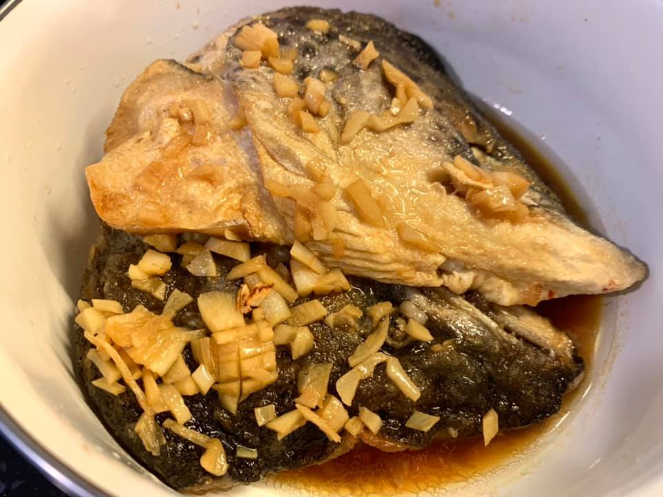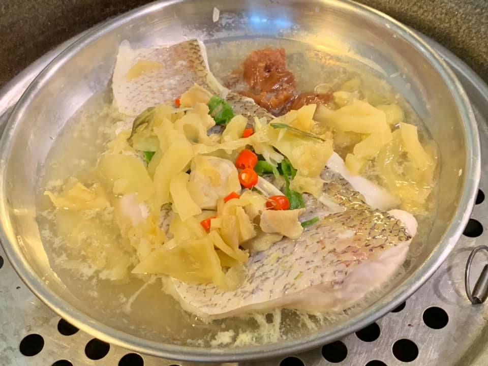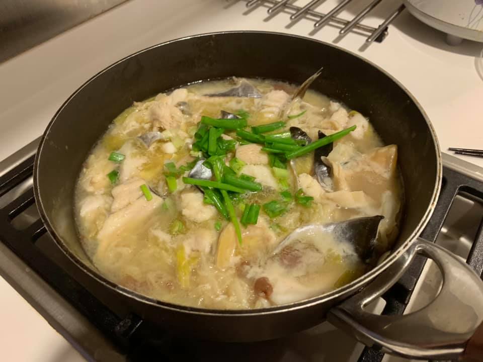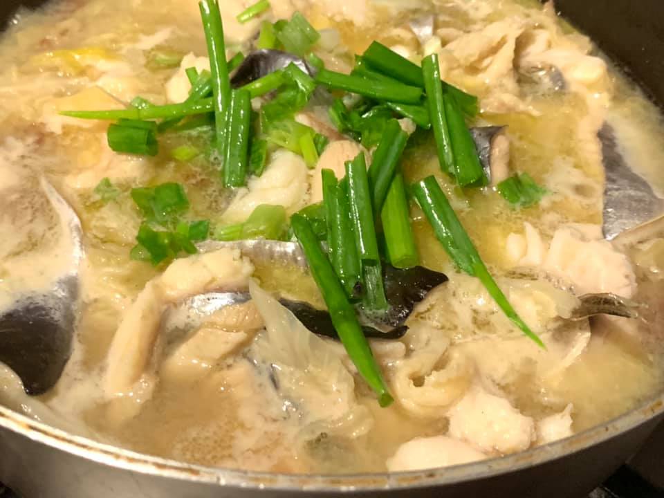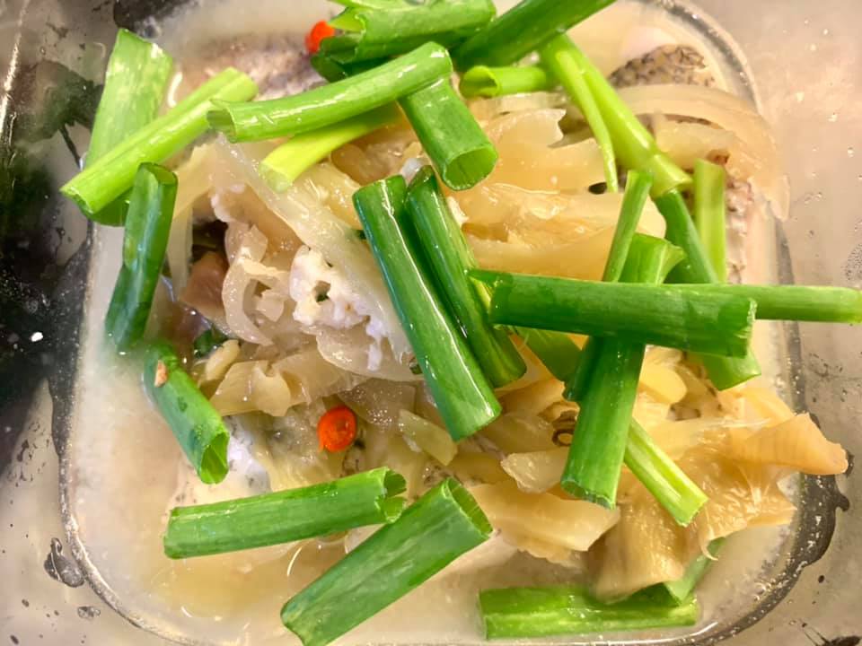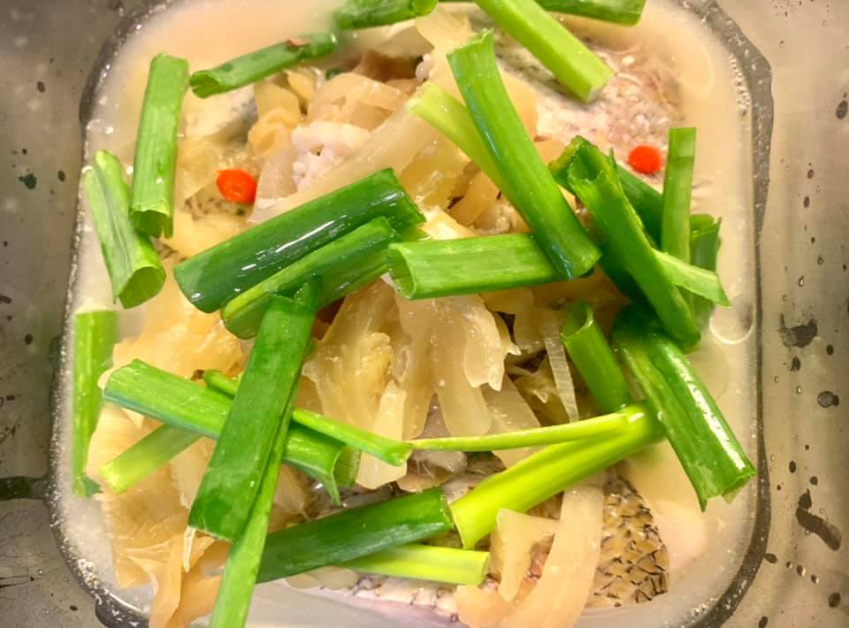 fried fish head and bones with lots of browned crisp julienned ginger, 1 chilli padi, 5 cloves garlic cut into 3 each, and 1/2 sliced red onions, added salt and boiled for 3 hrs, reduced to a very tasty whitish soup, added 3 tbsp huadiao wine, boiled another 1-2hrs with cabbage and added 1 sour plum mashed…very very sweet tasty soup, and added sliced fish poached and served.