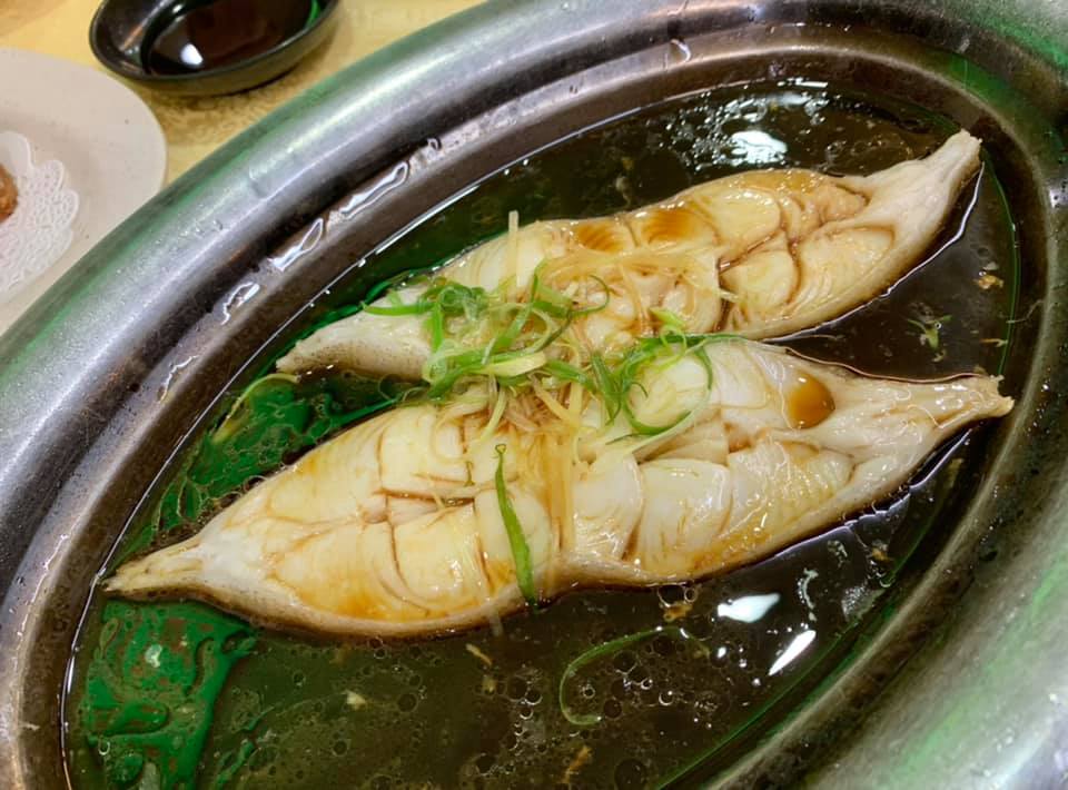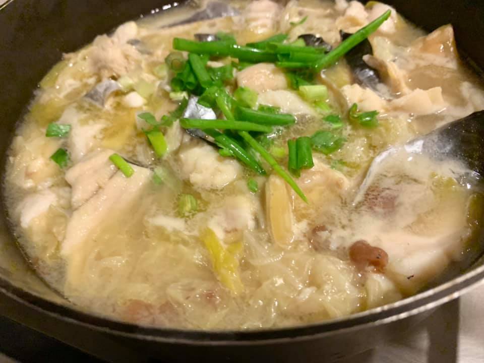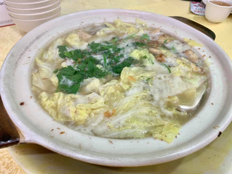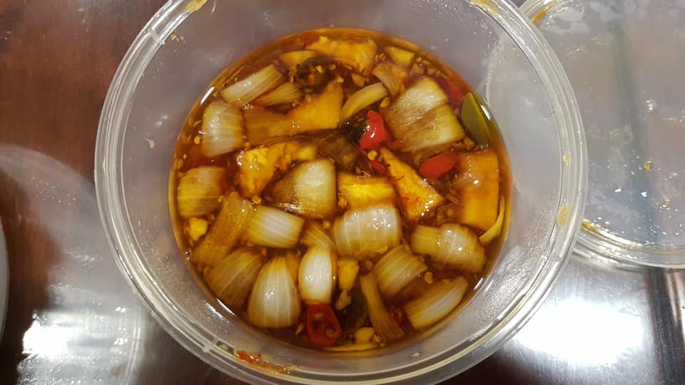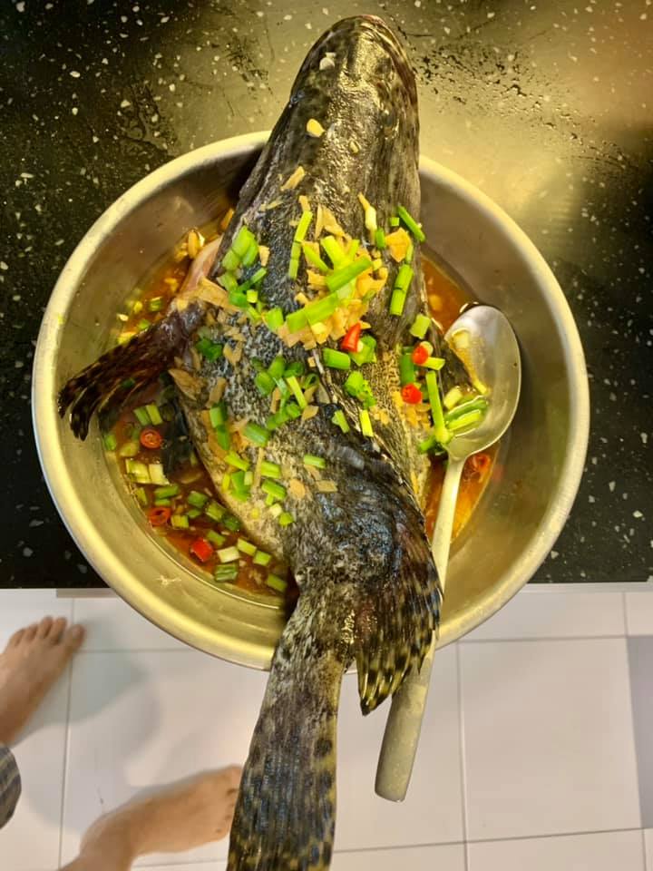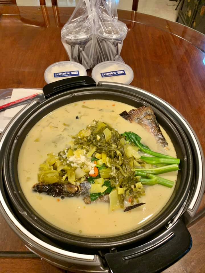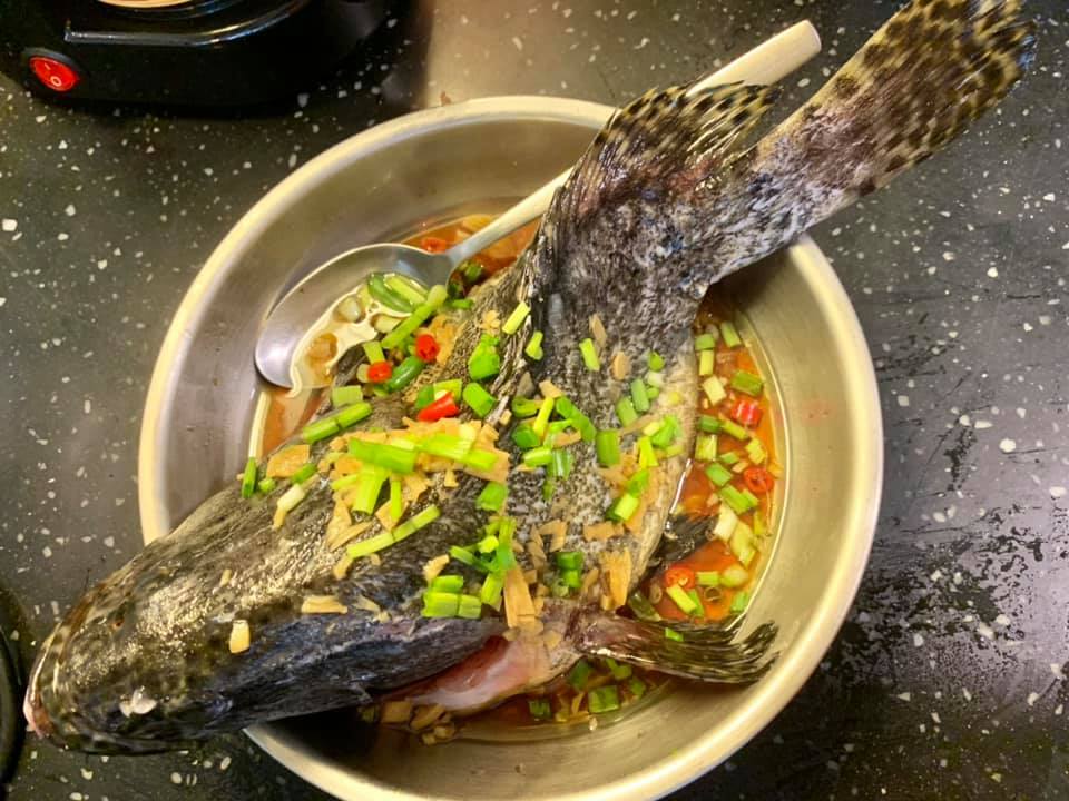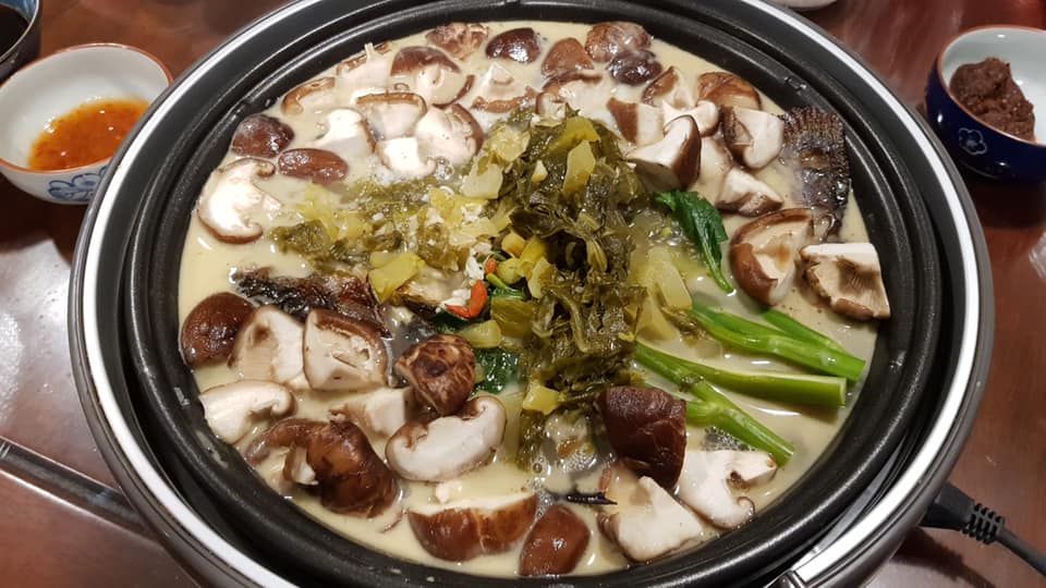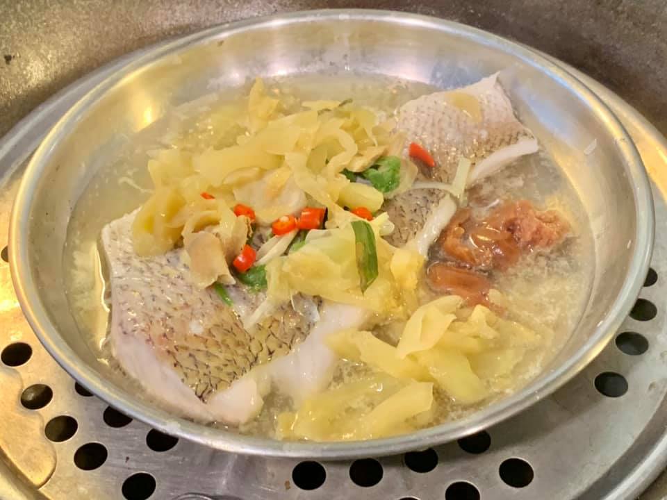 fried fish head and bones with lots of browned crisp julienned ginger, 1 chilli padi, 5 cloves garlic cut into 3 each, and 1/2 sliced red onions, added salt and boiled for 3 hrs, reduced to a very tasty whitish soup, added 3 tbsp huadiao wine, boiled another 1-2hrs with cabbage and added 1 sour plum mashed…very very sweet tasty soup, and added sliced fish poached and served.