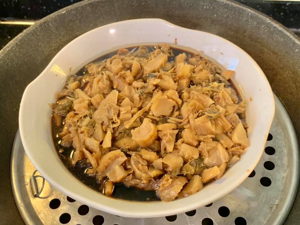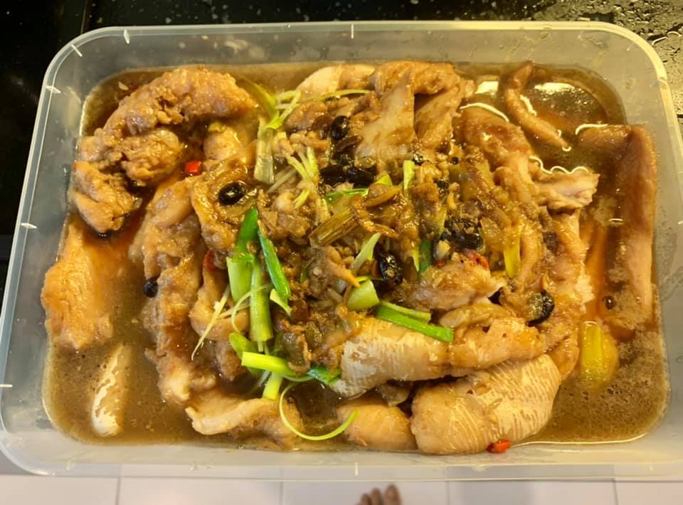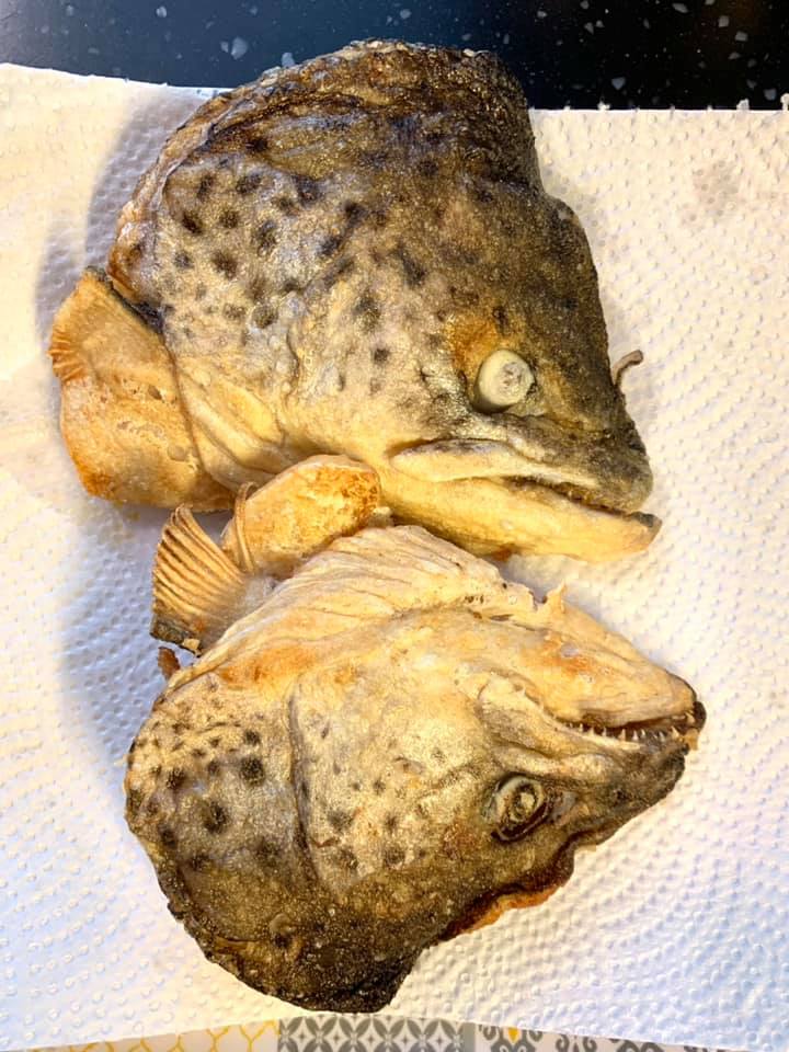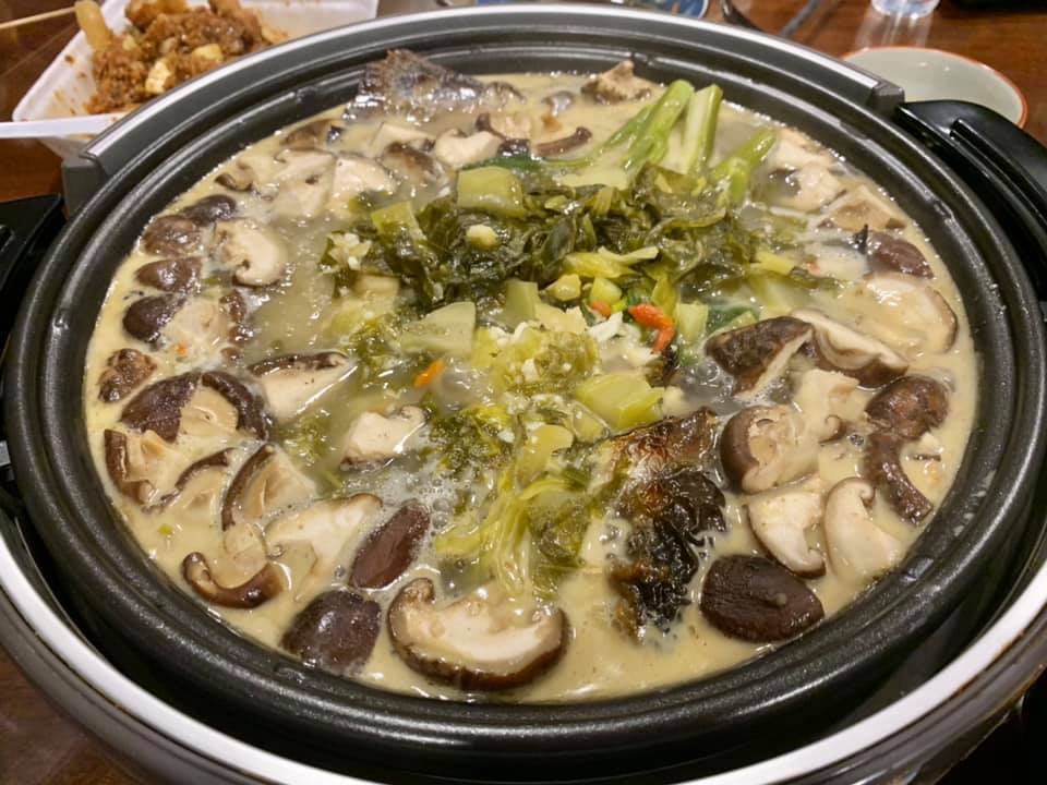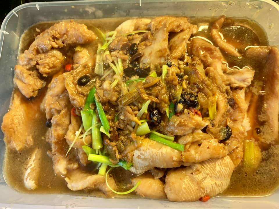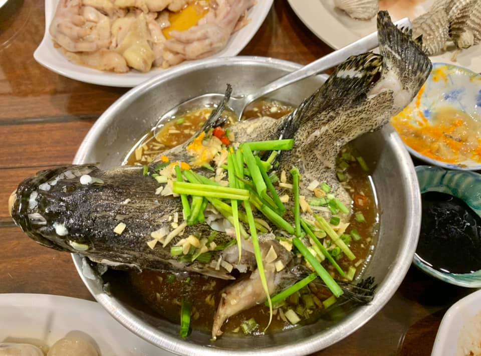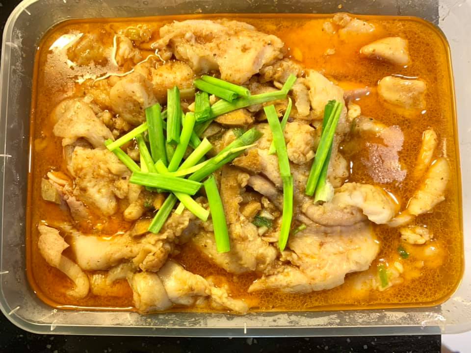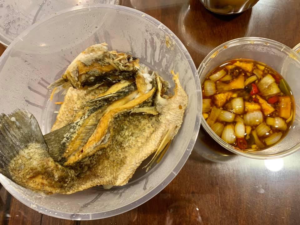 fried fish head and bones with lots of browned crisp julienned ginger, 1 chilli padi, 5 cloves garlic cut into 3 each, and 1/2 sliced red onions, added salt and boiled for 3 hrs, reduced to a very tasty whitish soup, added 3 tbsp huadiao wine, boiled another 1-2hrs with cabbage and added 1 sour plum mashed…very very sweet tasty soup, and added sliced fish poached and served.