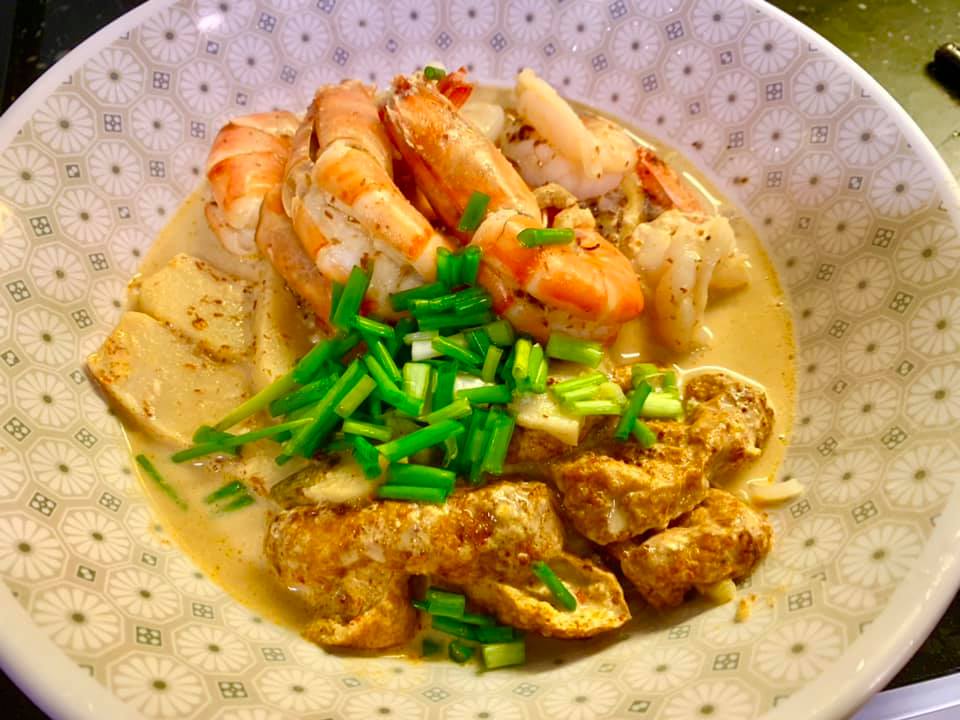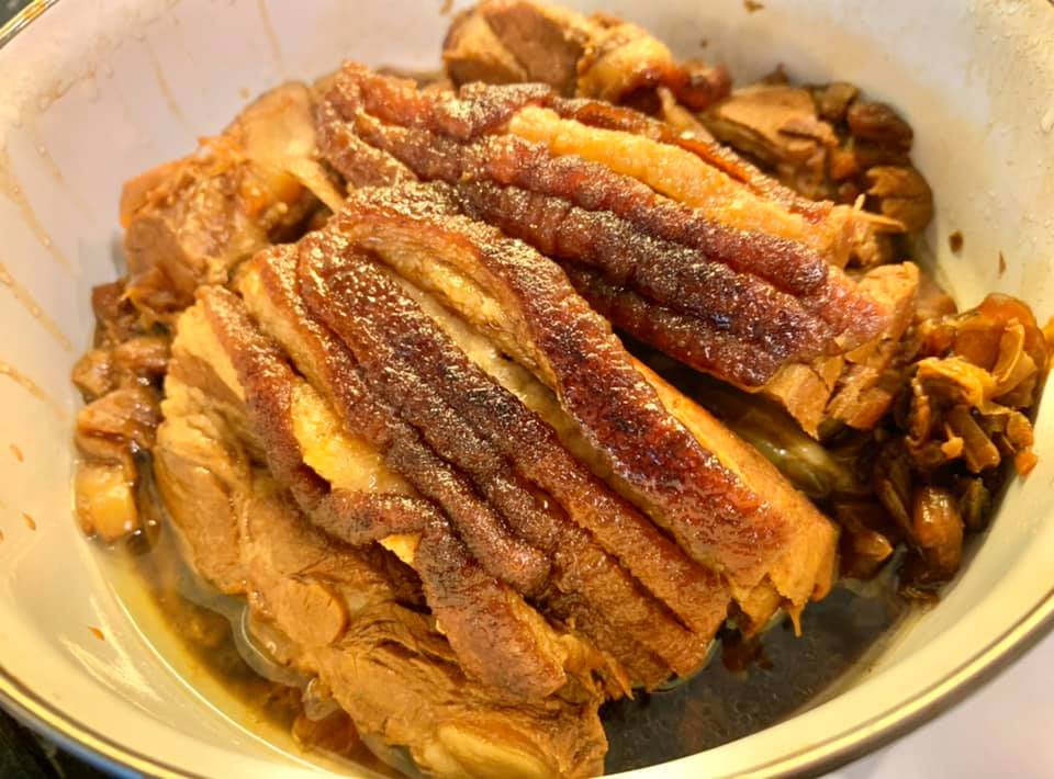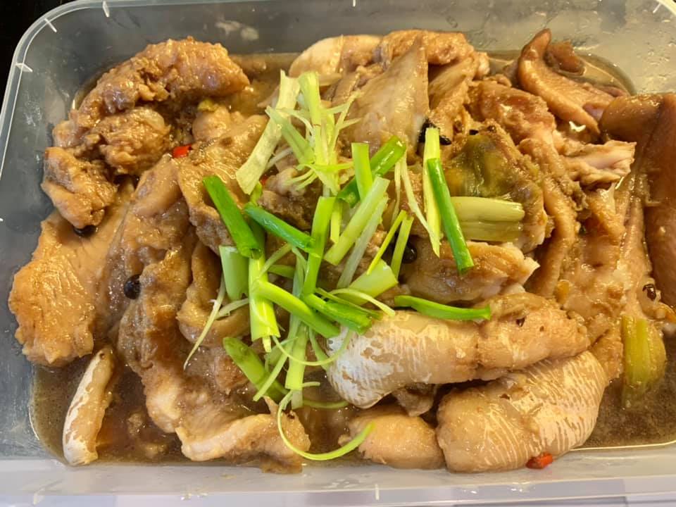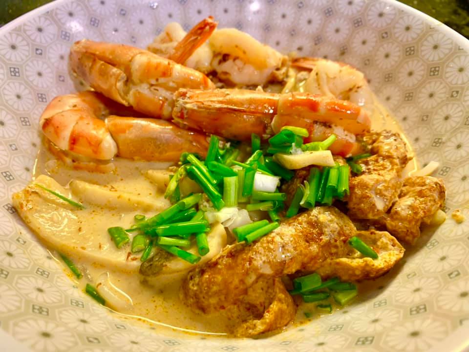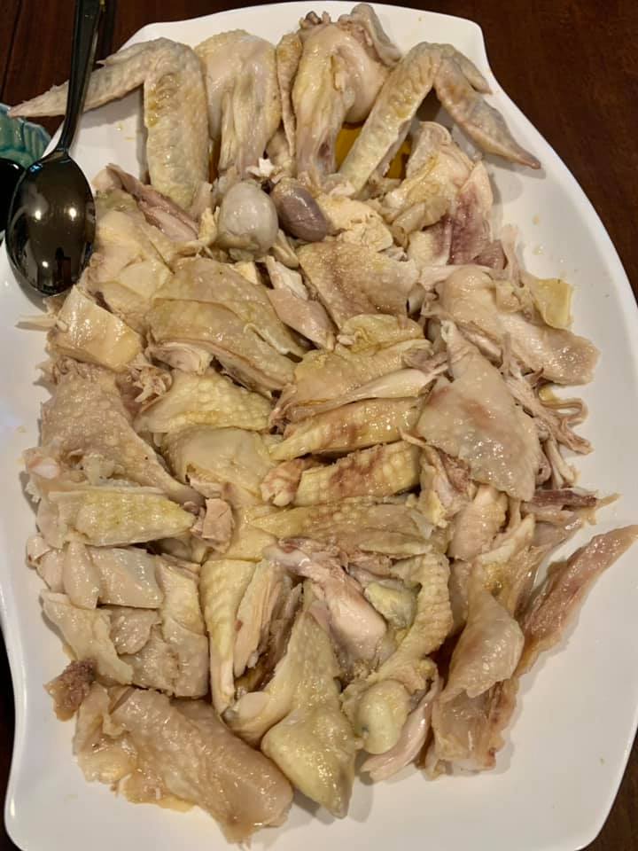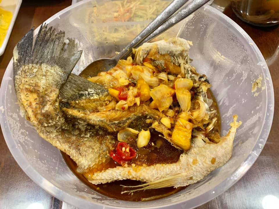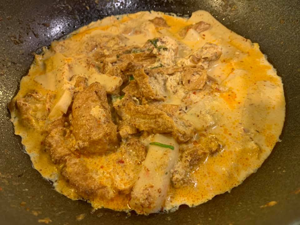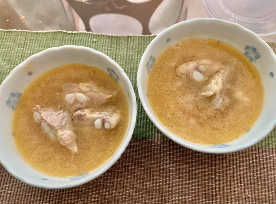 fried fish head and bones with lots of browned crisp julienned ginger, 1 chilli padi, 5 cloves garlic cut into 3 each, and 1/2 sliced red onions, added salt and boiled for 3 hrs, reduced to a very tasty whitish soup, added 3 tbsp huadiao wine, boiled another 1-2hrs with cabbage and added 1 sour plum mashed…very very sweet tasty soup, and added sliced fish poached and served.