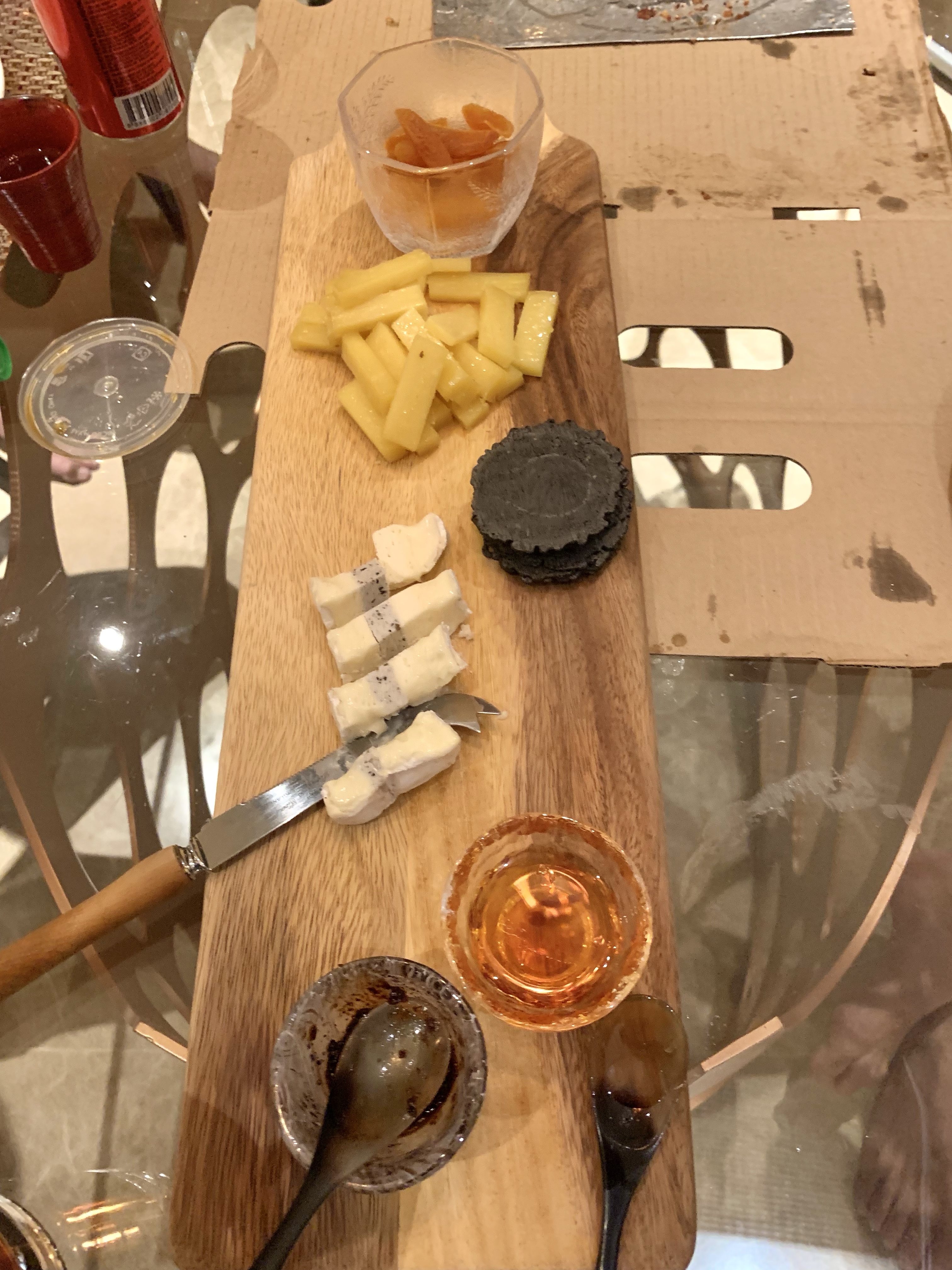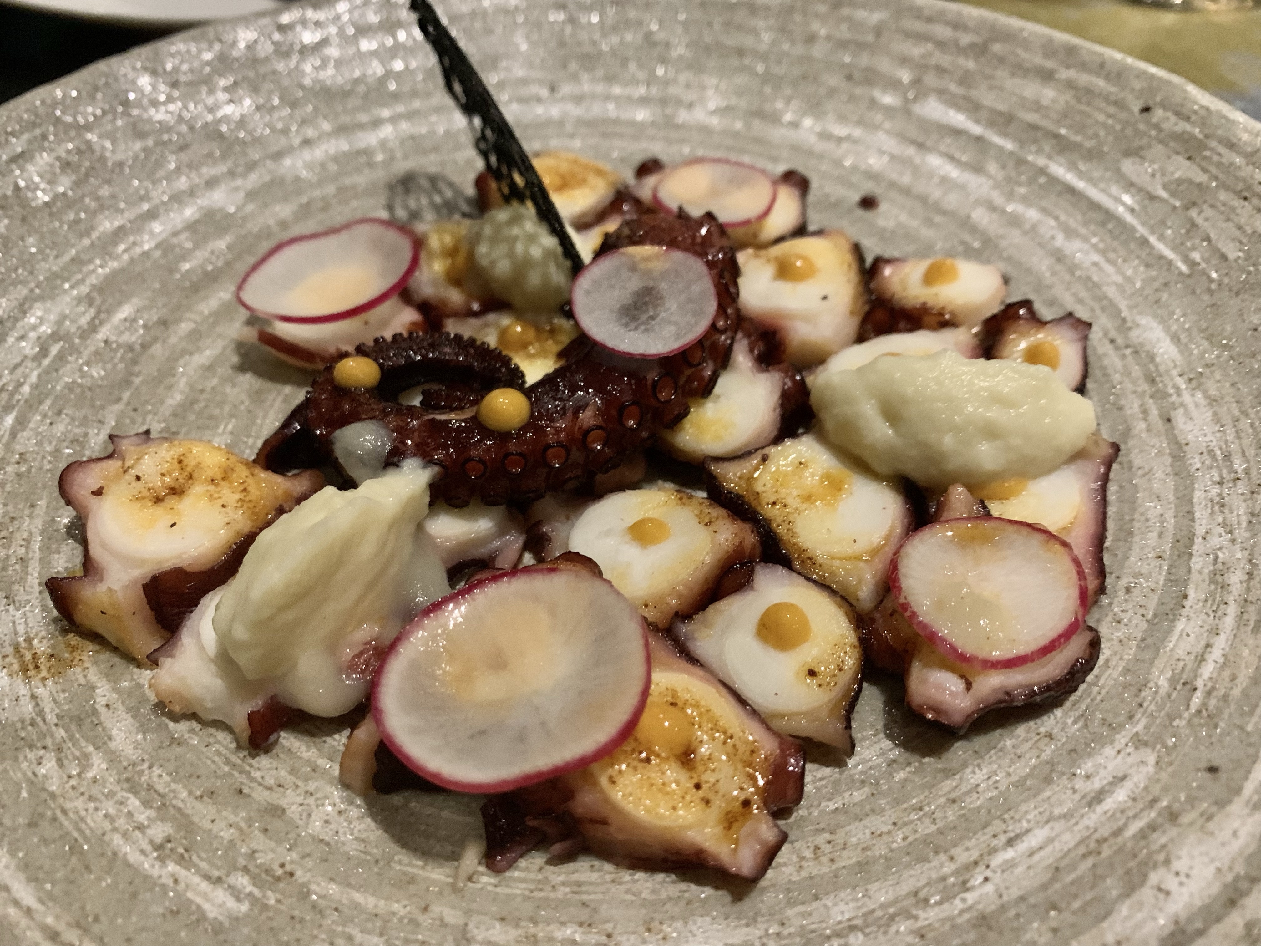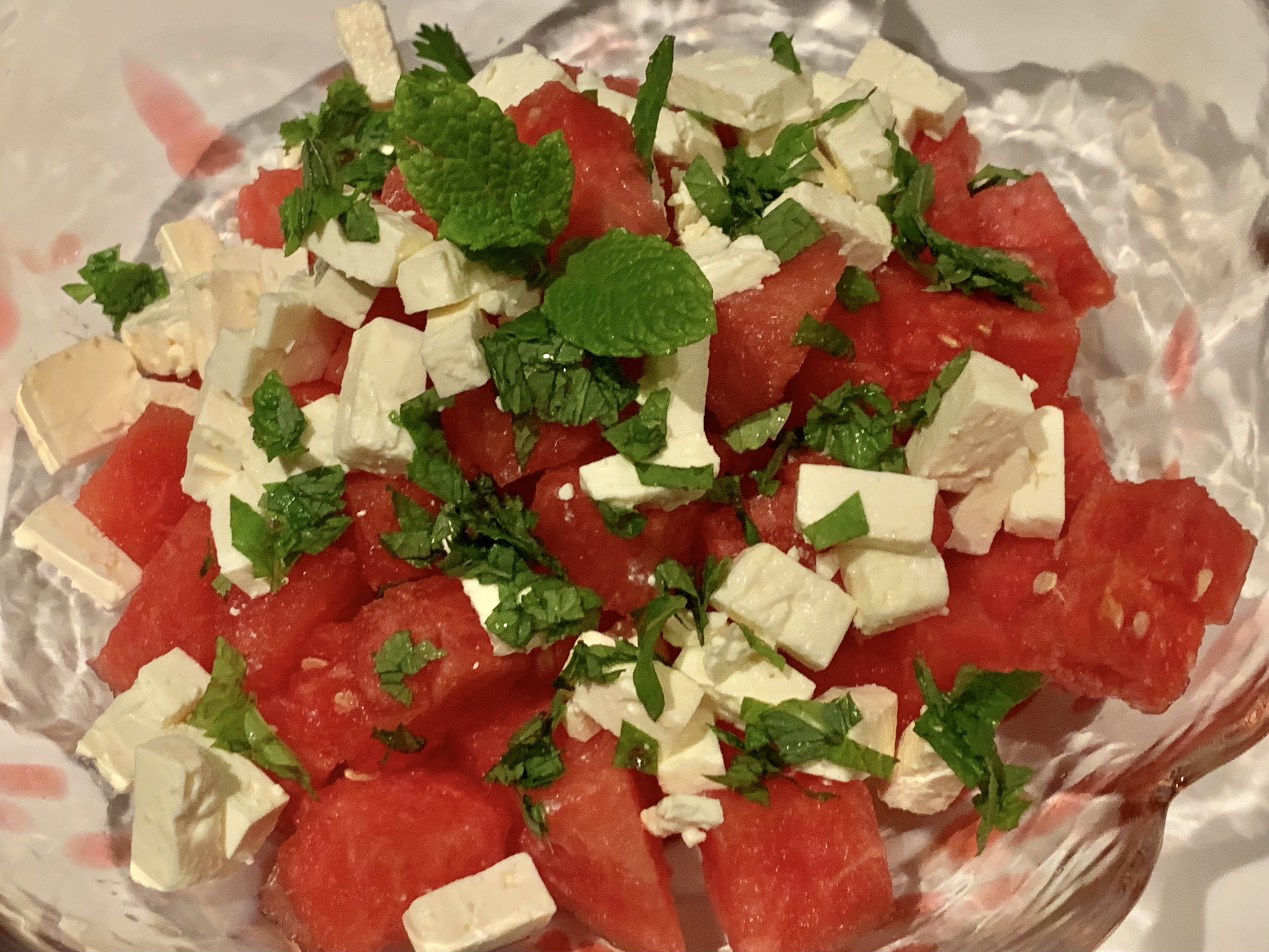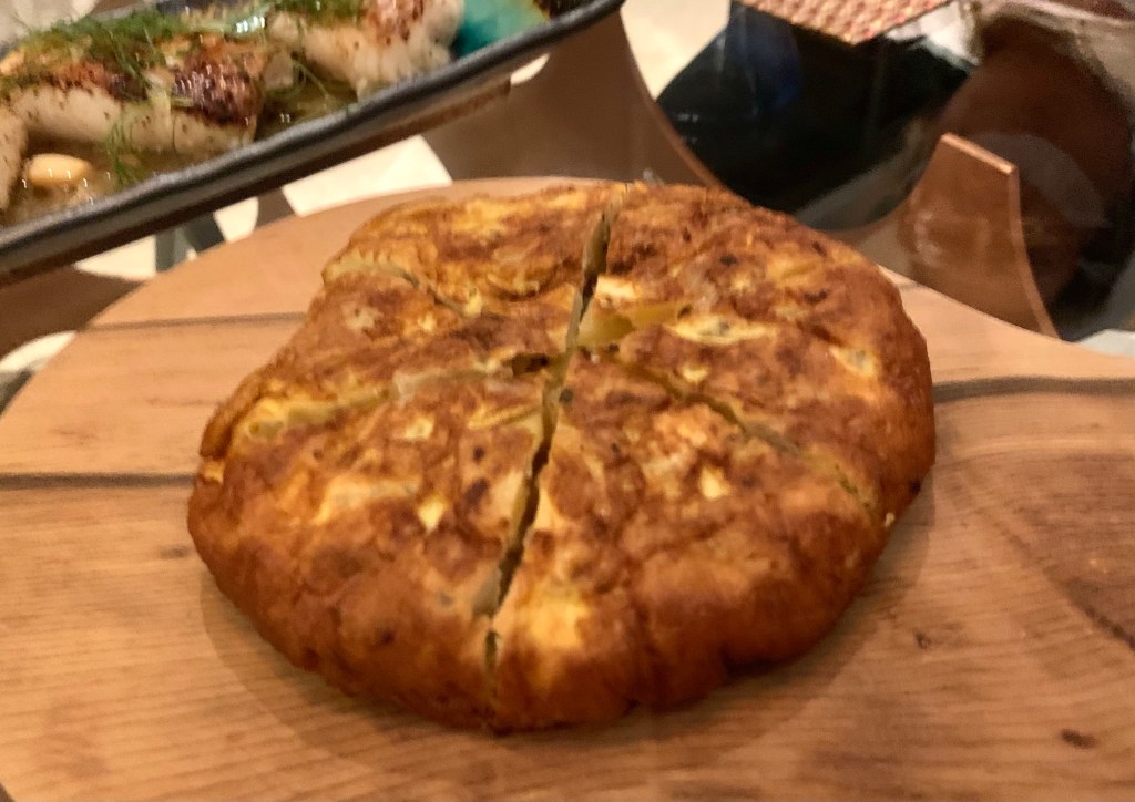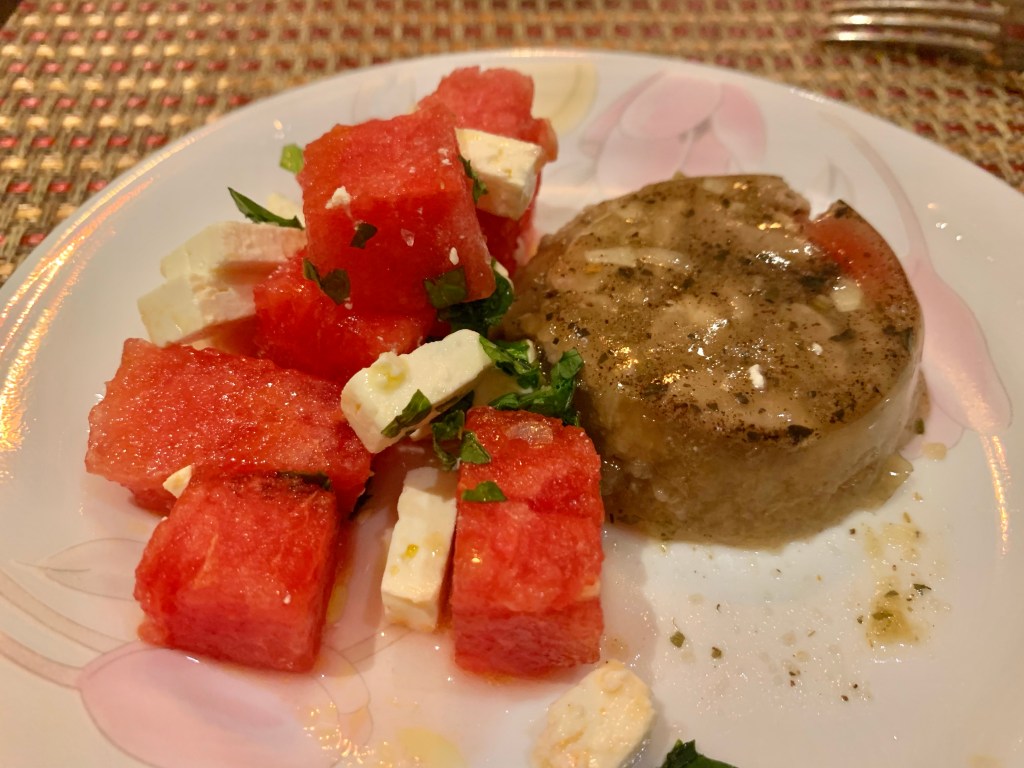 1 spanish omelette 2 watermelon feta cheese mint salad salad + plus pork collar terrine (experiment) 3 grilled scallops on chopped cauliflower on cauliflower gazpacho 4 grilled halibut in soy beurre blanc (butter white wine) sauce 5 grilled scallop on truffle angel hair 6 sous vide australian pork chop in red wine tomatoes ratatouille 7 seafood squidink pasta