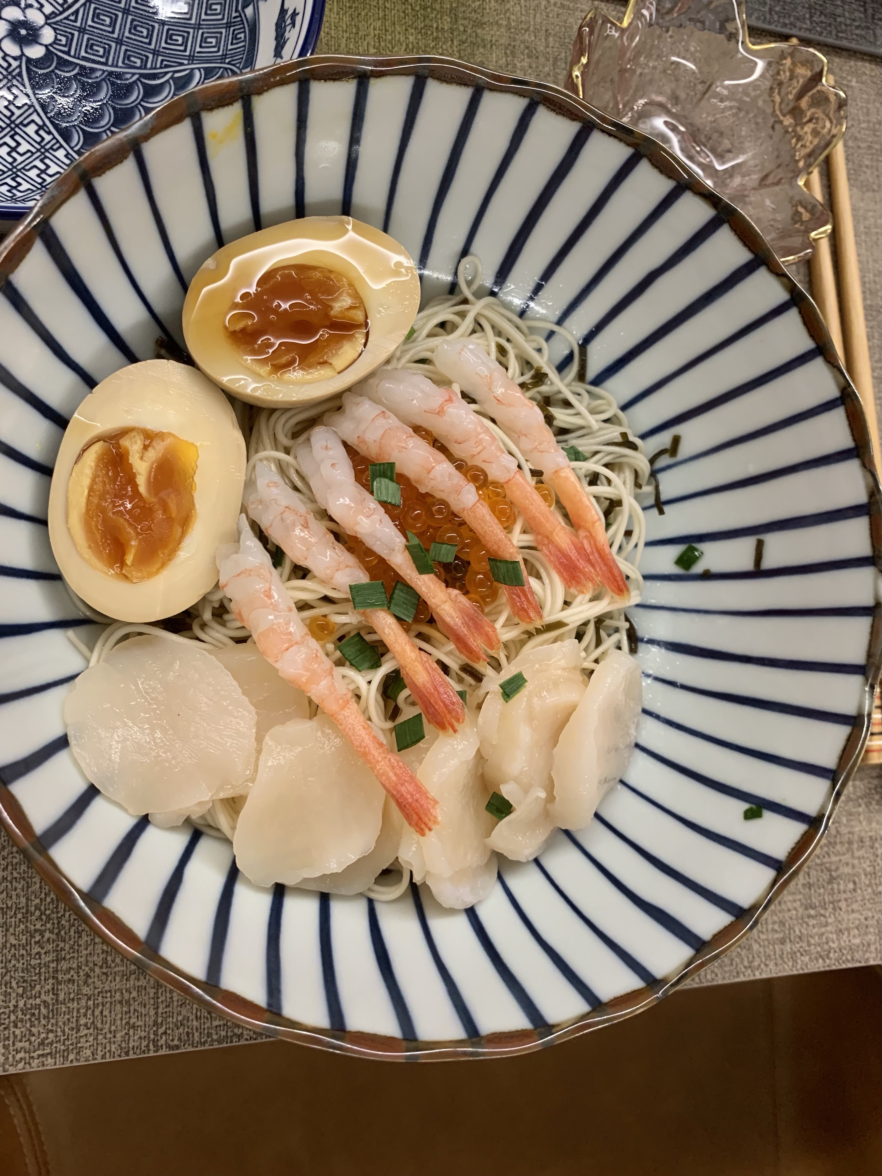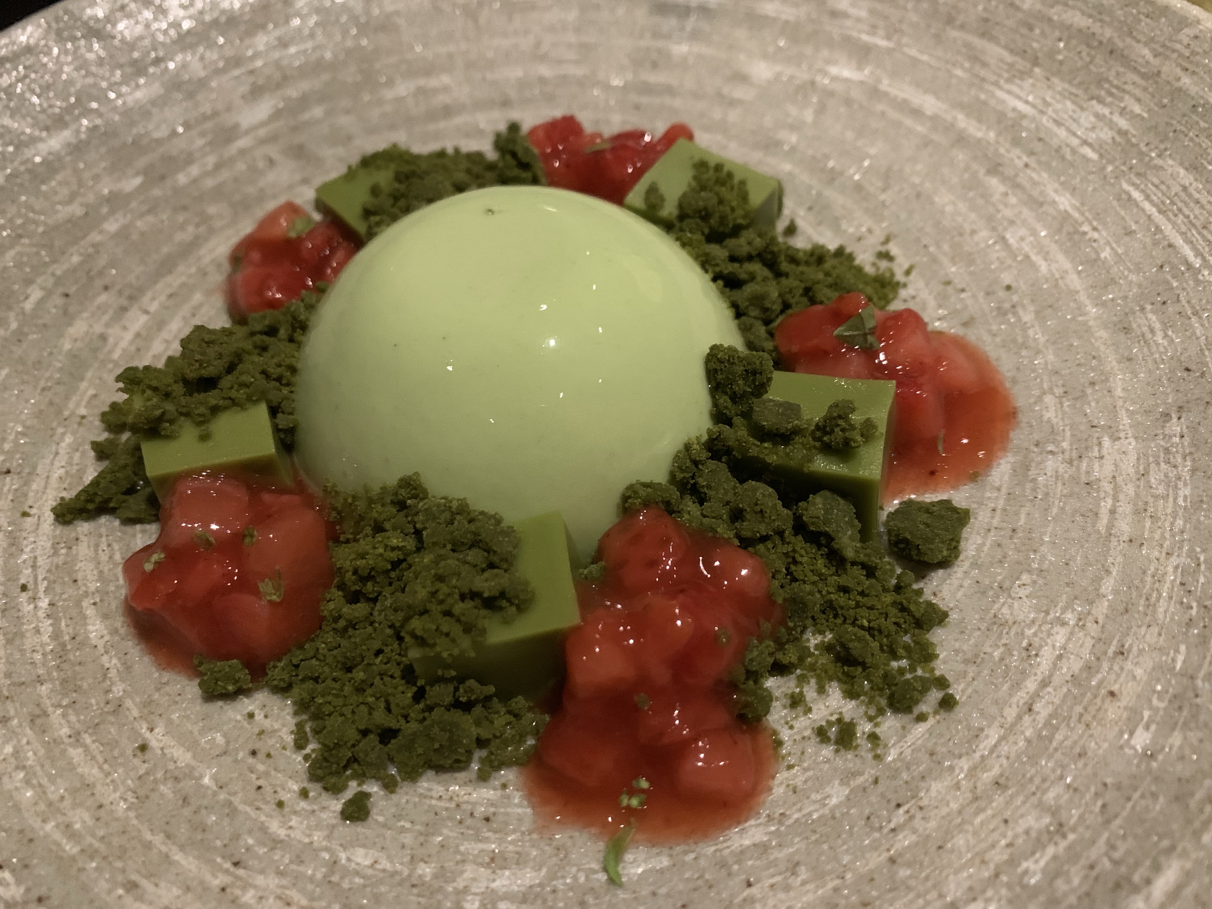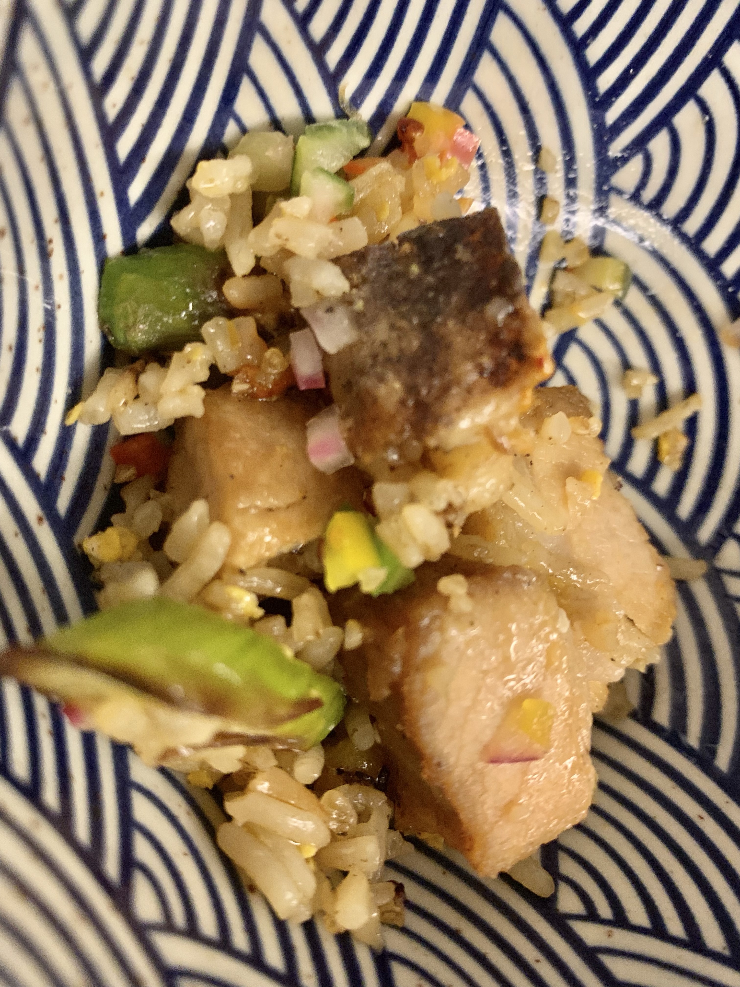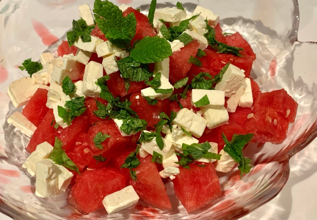1 spanish omelette 2 watermelon feta cheese mint salad salad + plus pork collar terrine (experiment) 3 grilled scallops on chopped cauliflower on cauliflower gazpacho 4 grilled halibut in soy beurre blanc (butter white wine) sauce 5 grilled scallop on truffle angel hair 6 sous vide australian pork chop in red wine tomatoes ratatouille 7 seafood squidink pasta