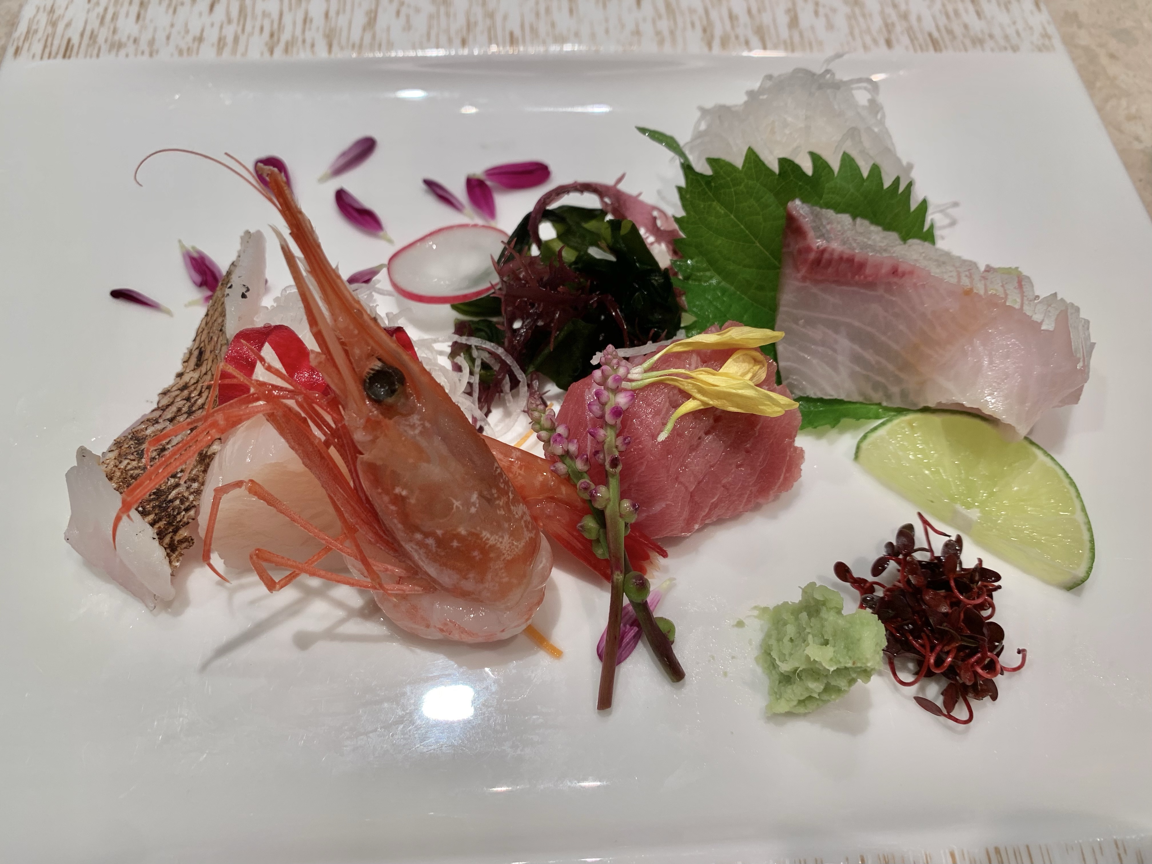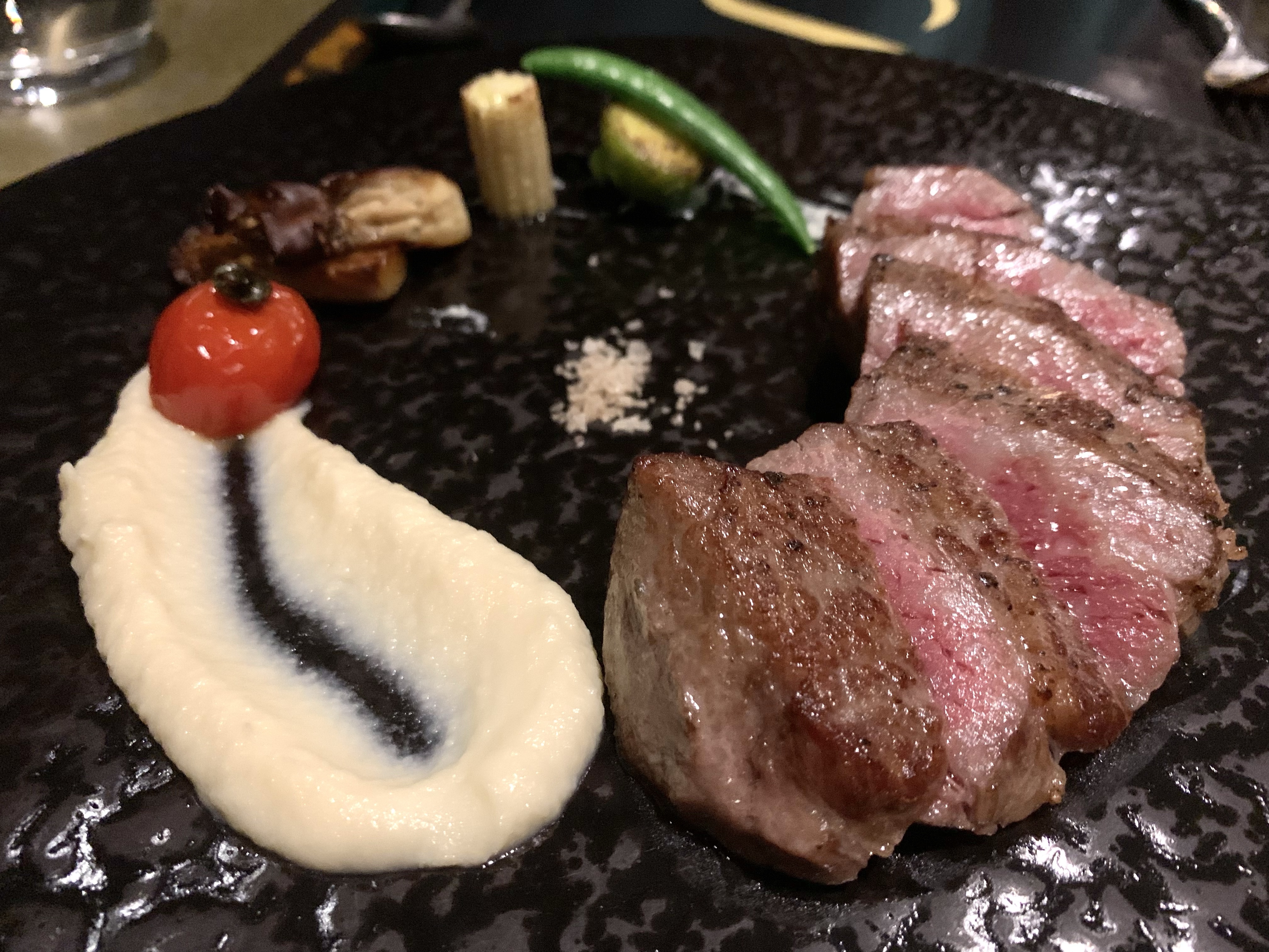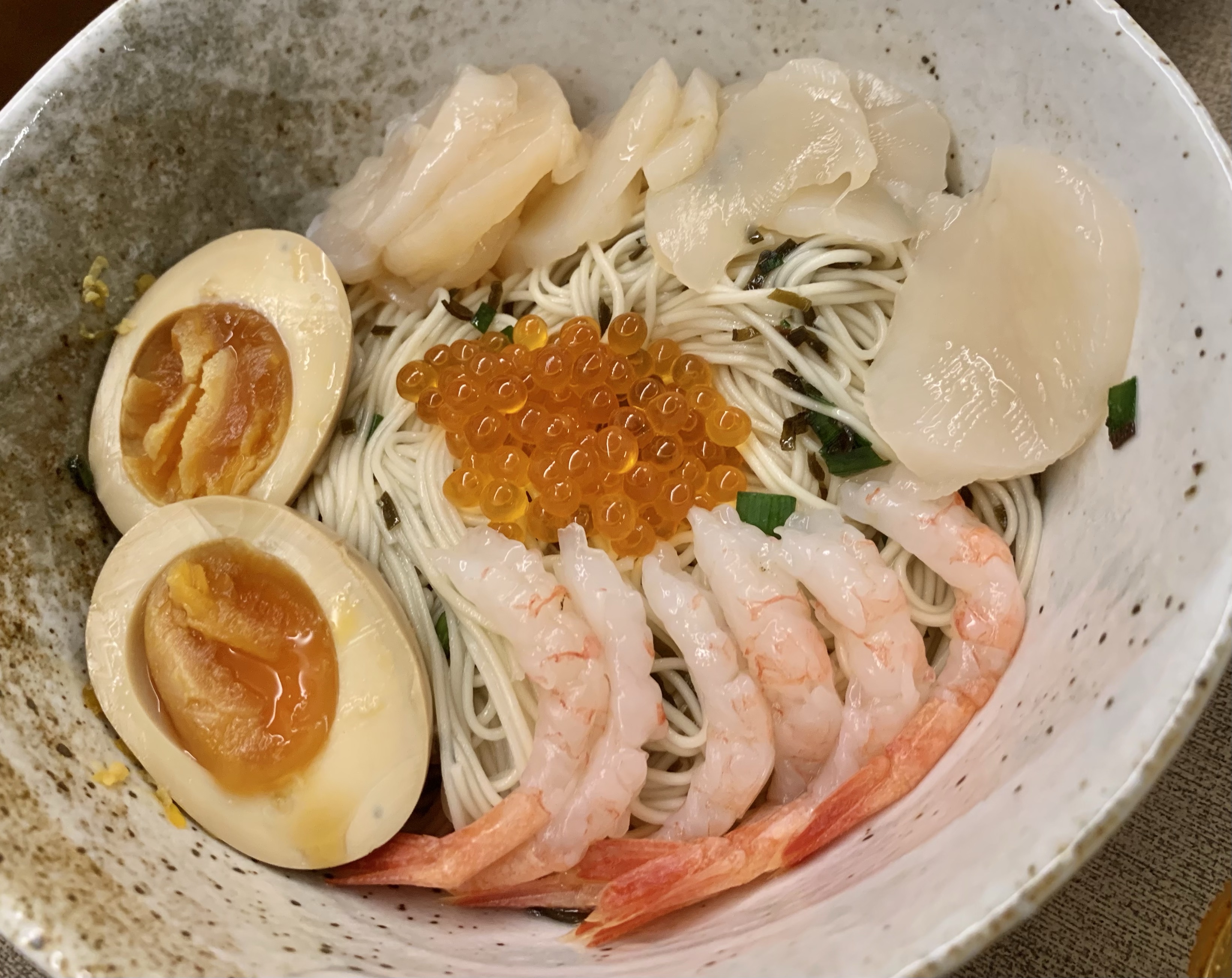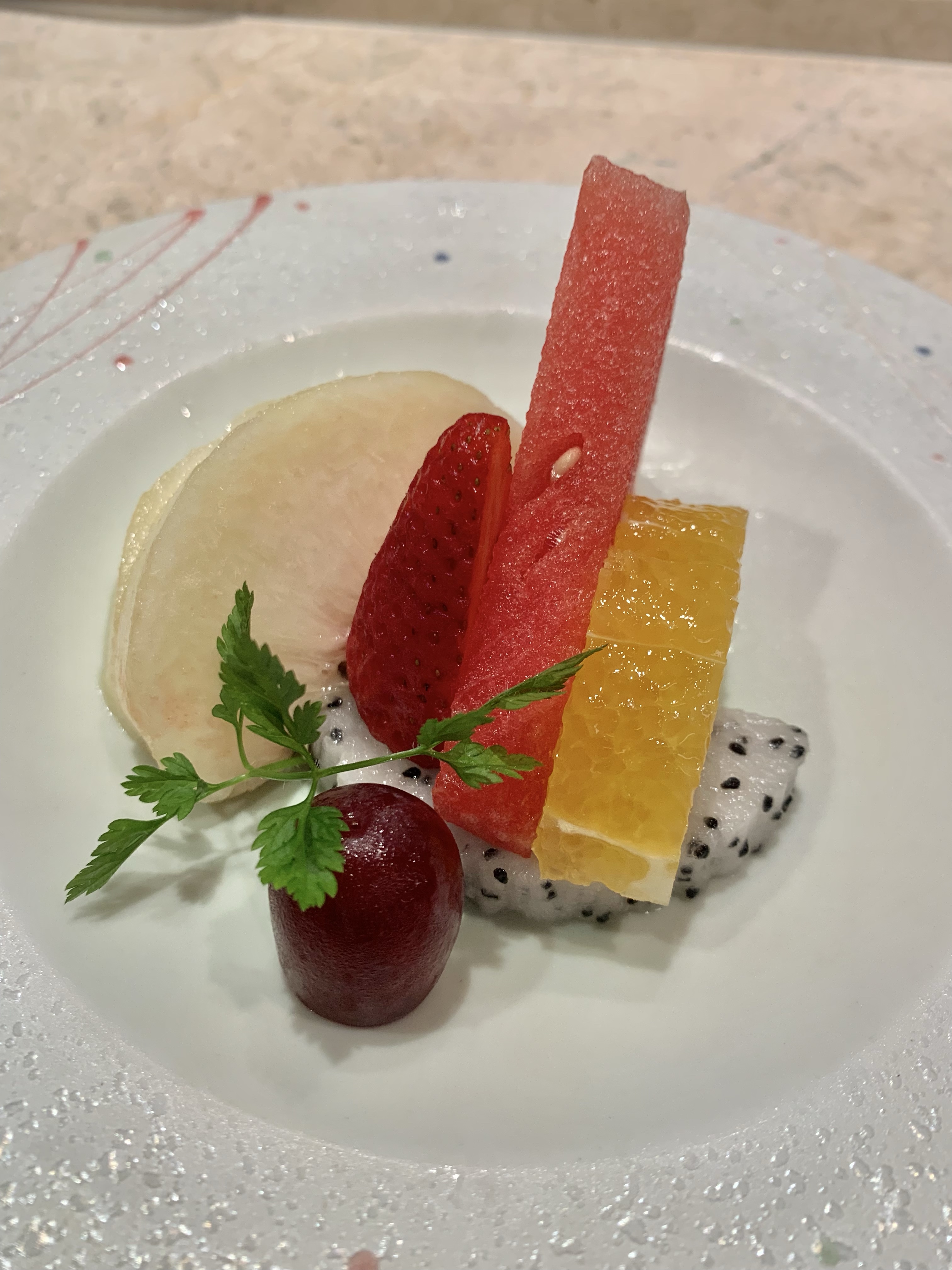1 spanish omelette 2 watermelon feta cheese mint salad salad + plus pork collar terrine (experiment) 3 grilled scallops on chopped cauliflower on cauliflower gazpacho 4 grilled halibut in soy beurre blanc (butter white wine) sauce 5 grilled scallop on truffle angel hair 6 sous vide australian pork chop in red wine tomatoes ratatouille 7 seafood squidink pasta