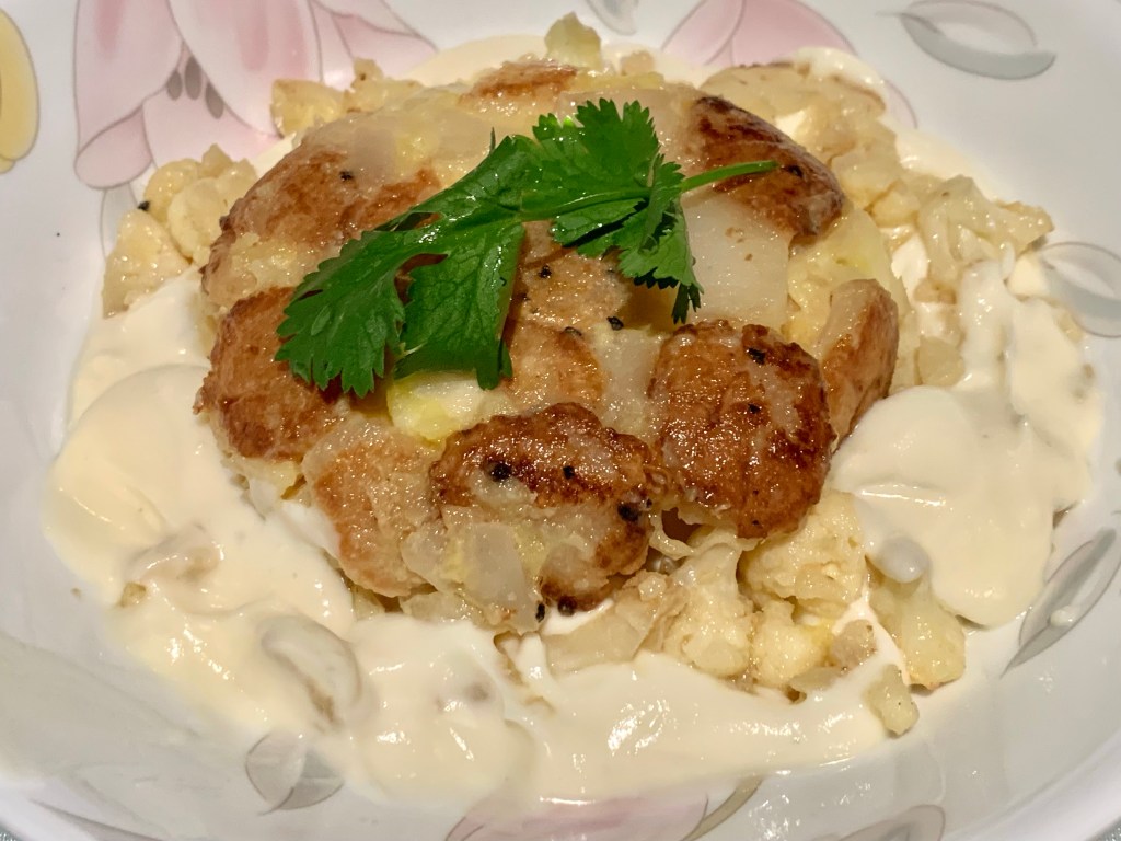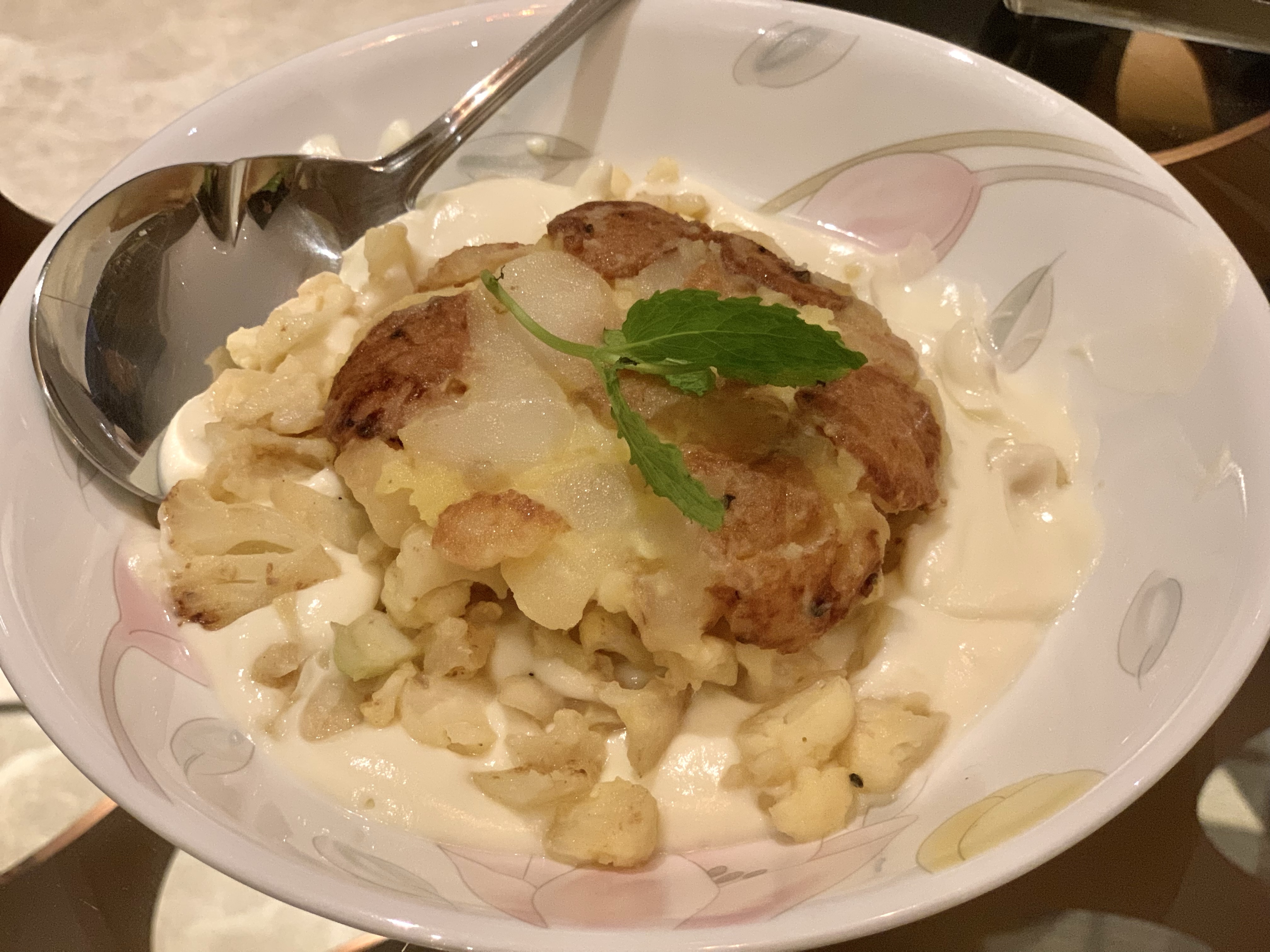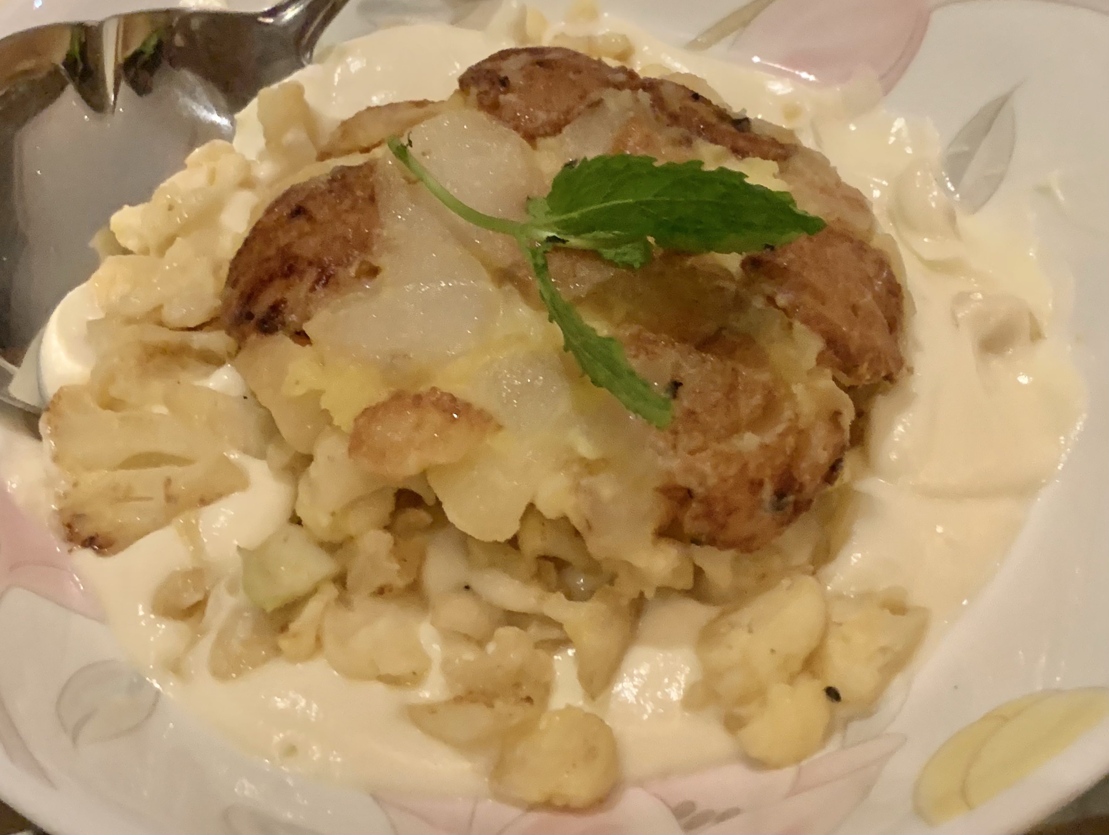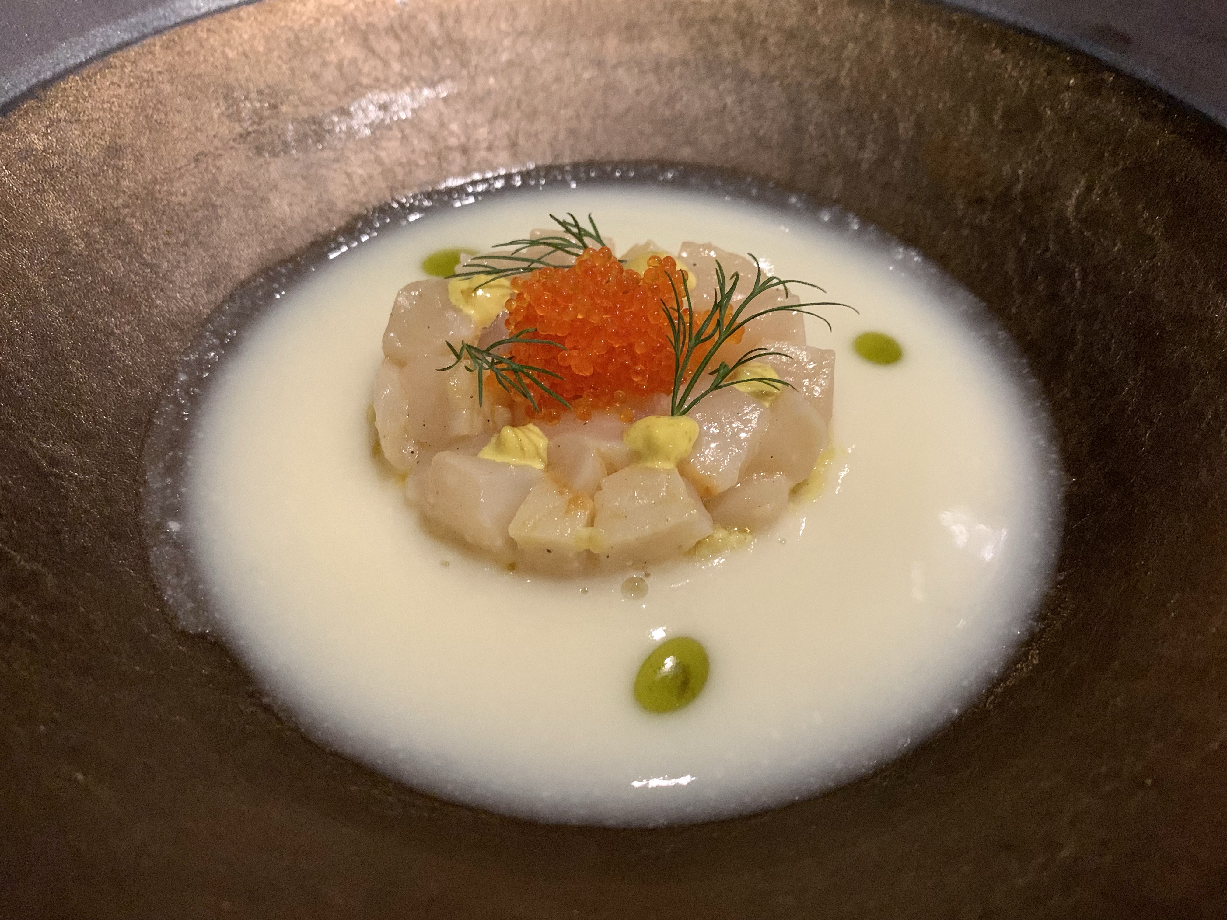 grilled scallops on chopped cauliflower on cauliflower gazpacho