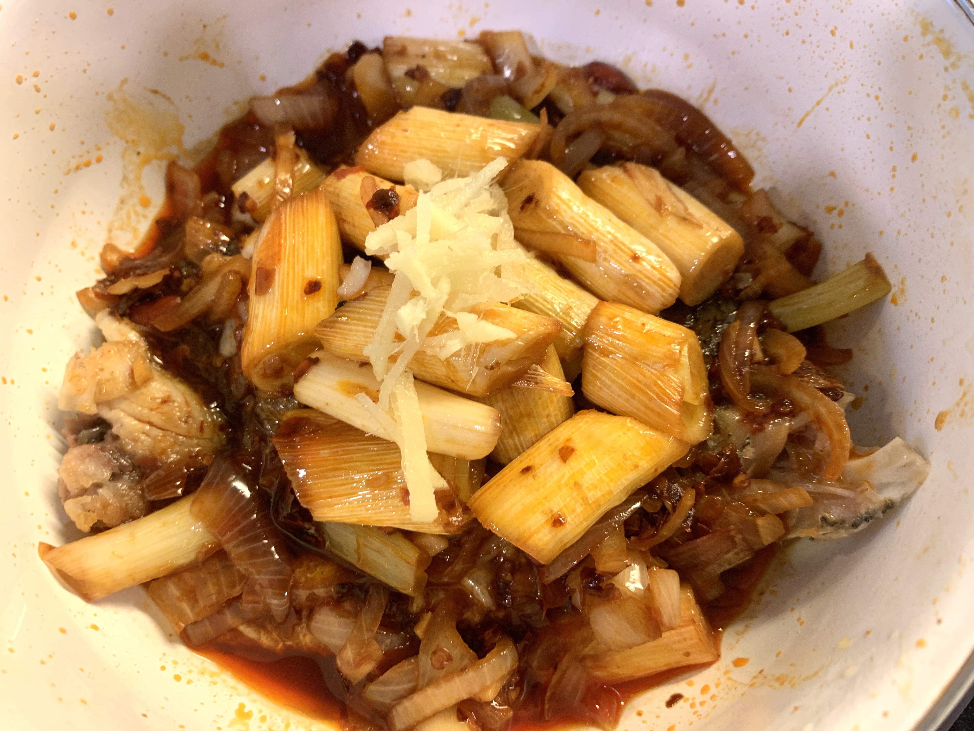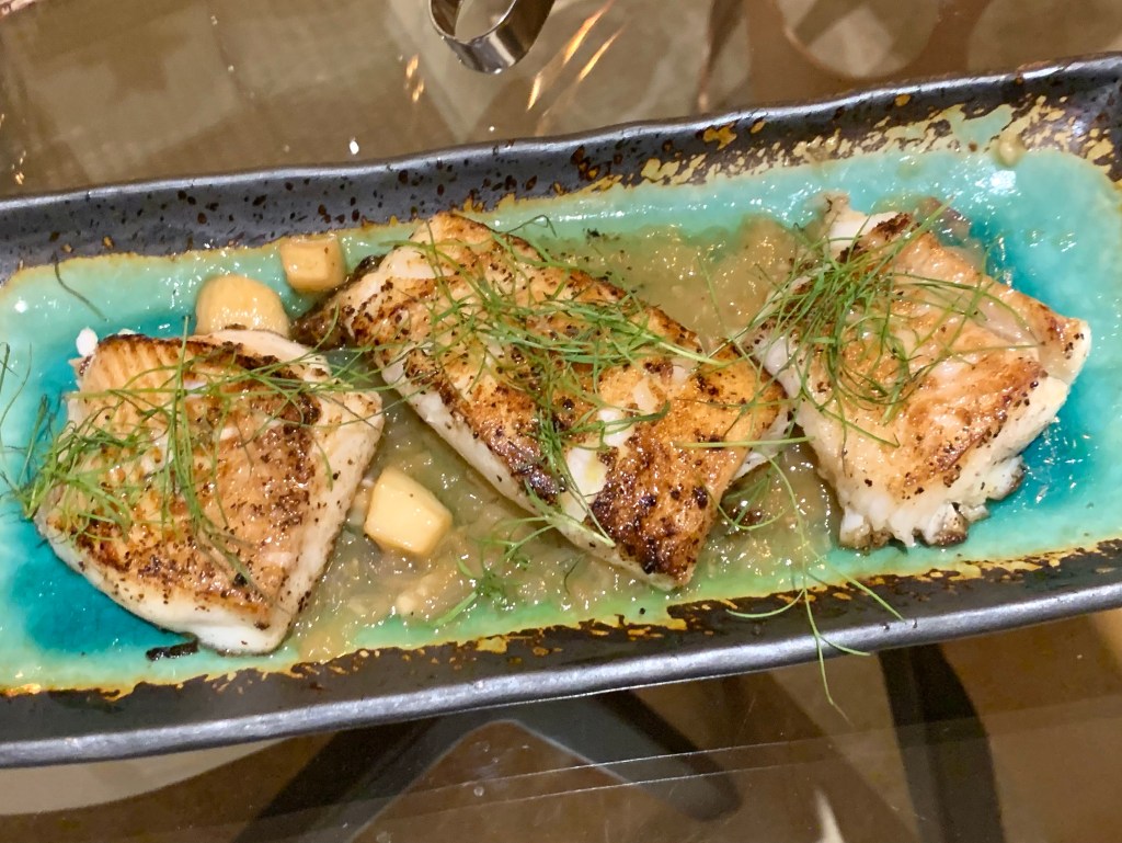 grilled halibut in soy beurre blanc (butter white wine) sauce